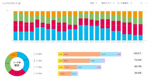 登録ブランド名について言及されたTweet数と口コミ内容を分析、可視化します。新聞・テレビ・雑誌・Webの露出と一元管理が可能なため、統合的な分析やレポート作成も可能です。
