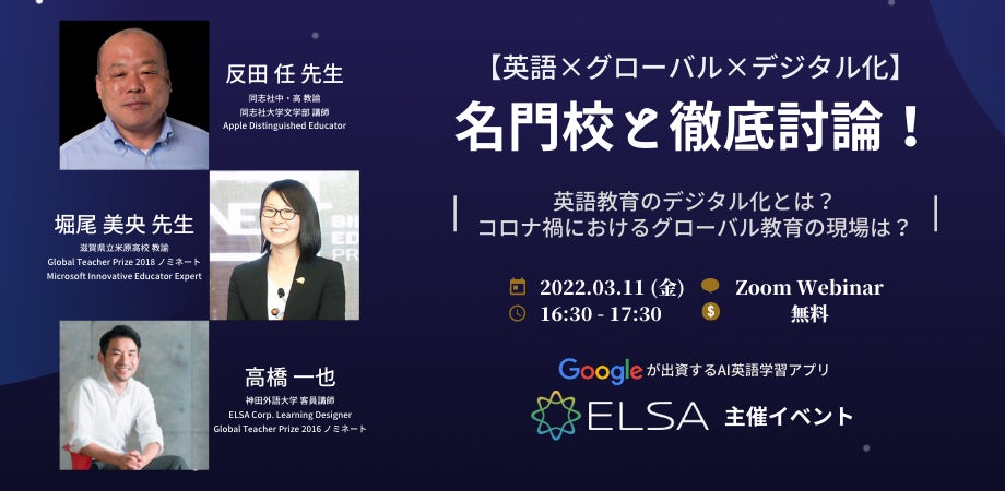 米国・スタンフォード大学発のAI発音コーチアプリ "ELSA Speak" を開発する ELSA Corp. (CEO: Vu Van) は、新指導要領導入やGIGAスクール構想によるDX推進のもとで、次世代に向けた英語教育やグローバル人材育成のための教育に関するウェビナーを、2022年3月11日(金) 16時30分より開催致します。