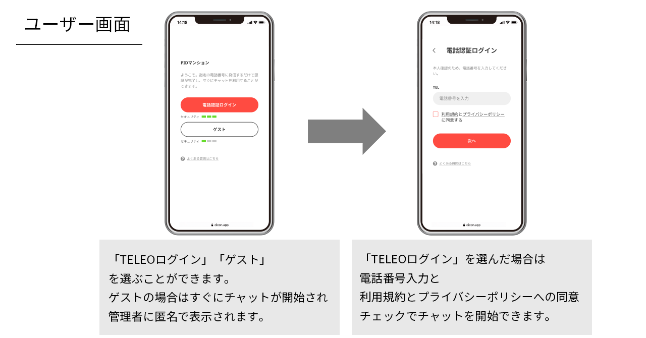 入居者はチャットの内容に応じて「電話発信認証サービスTELEO」を利用せず、ゲストとして匿名でチャットを利用することもできます。