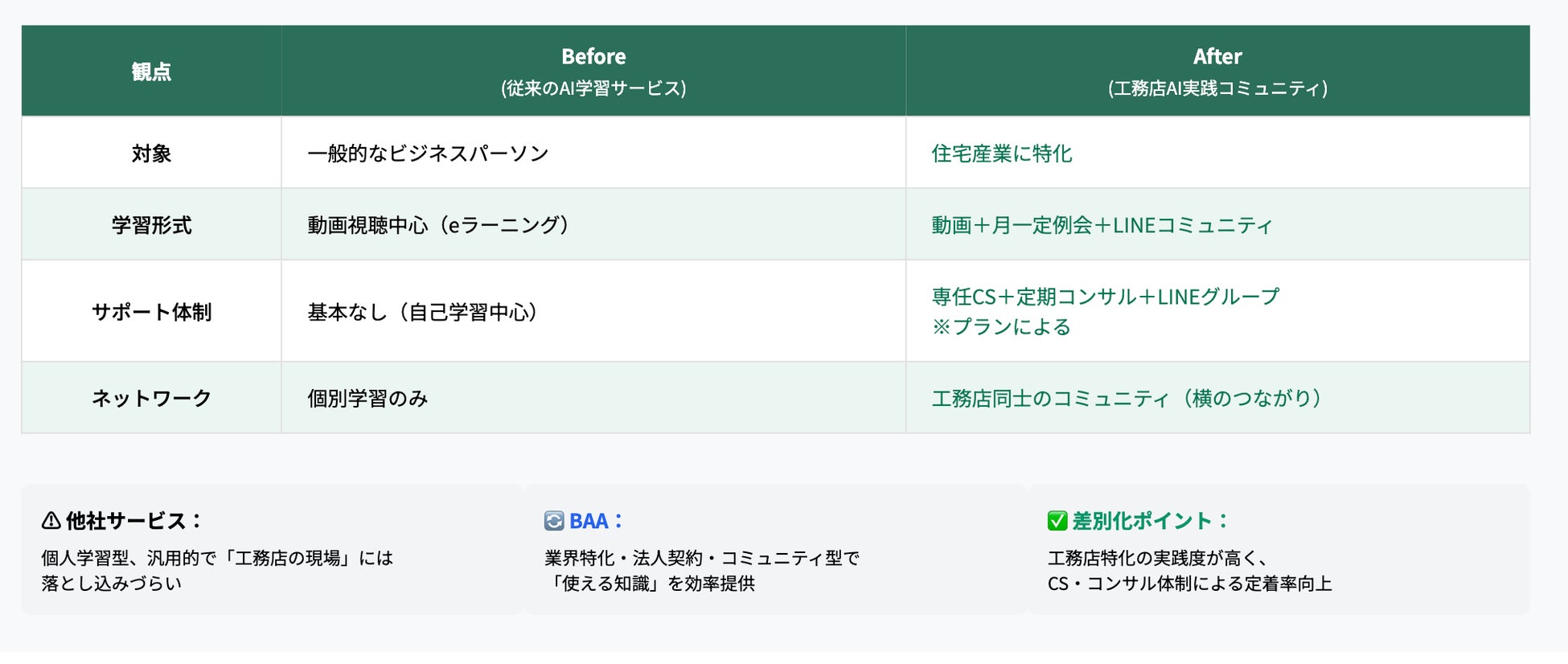 従来のAI学習サービスが“個人学習中心・汎用的”であるのに対し、BAAは住宅業界に特化した実務直結型の仕組みを提供します。専任CSや定期コンサルによる支援、そして工務店同士をつなぐコミュニティにより、“現場で活かせるAI活用”を実現します。
