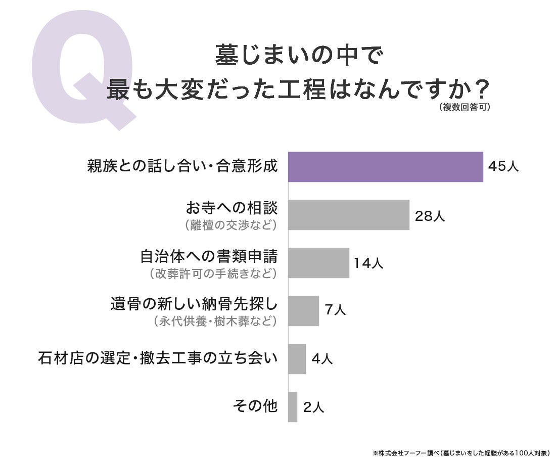 墓じまいの中で最も大変だった工程を尋ねたところ、最多は「親族との話し合い・合意形成」45人(45.00%)でした。