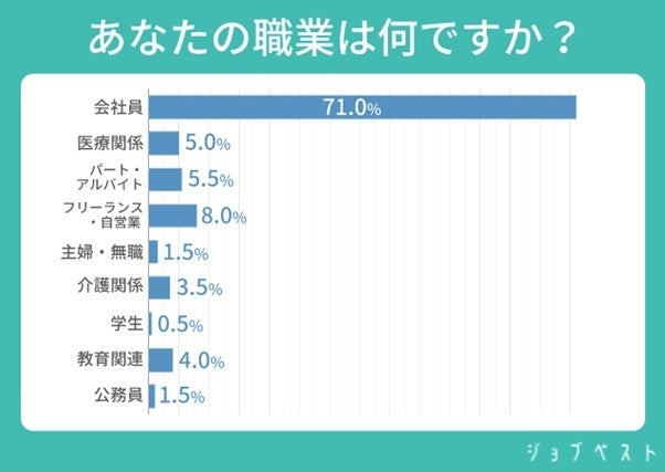 職業について質問すると、71%の方が会社員と回答しました。今回のアンケートでは多くの方が会社員ということが分かります。
