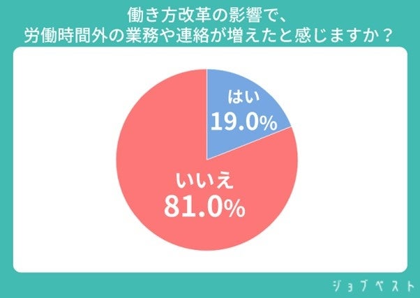 「働き方改革の影響で、労働時間外の業務や連絡が増えたと感じますか」との質問には、19%の方が「はい」と回答しました。