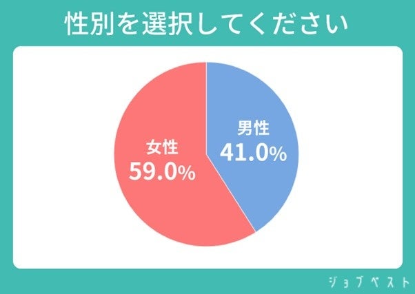 性別について質問すると、59%の方が女性と回答しました。今回のアンケートでは回答者の約6割の方が女性で、男性は女性よりも少なめとなっています。