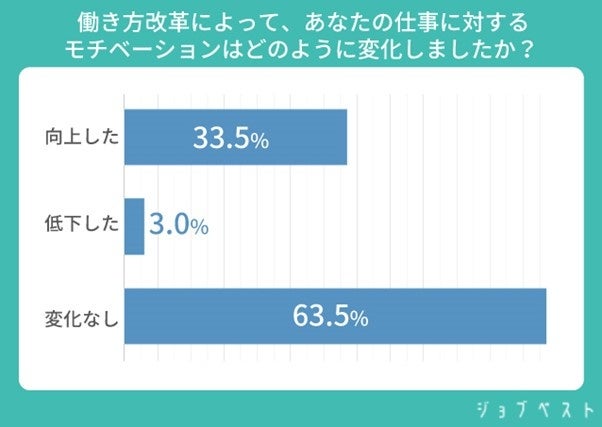 「働き方改革によって、あなたの仕事に対するモチベーションはどのように変化しましたか?」という質問に対して、「変化なし」と回答した方が最も多く63.5%となりました。