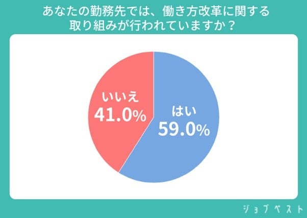 「勤務先で働き方改革に関する取り組みが行われていますか」という質問に対して、59%の方が「はい」と回答しました。約6割の方の勤務先で働き方改革が行われている一方で、約4割の方の勤務先ではまだ働き方改革が行われていないという結果となっています。