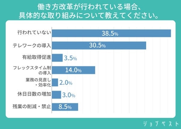 「働き方改革が行われている場合、具体的な取り組みについて教えてください」という質問において、テレワークの導入を挙げた方が最も多く、30.5%となりました。