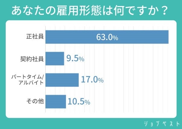 雇用形態に関する質問に対して、63%の方が正社員と回答しました。次にパートタイム・アルバイトと回答した方が17%と多かったです。今回のアンケートでは、半数以上の方が正社員として仕事をしていることが分かります。