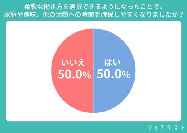 「柔軟な働き方を選択できるようになったことで、家庭や趣味、他の活動への時間を確保しやすくなりましたか」という質問ではちょうど半数の方が「はい」と回答しました。