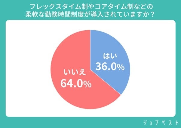 「フレックスタイム制やコアタイム制などの柔軟な勤務時間制度が導入されていますか」という質問をすると、「いいえ」と回答した方が64%という結果になりました。