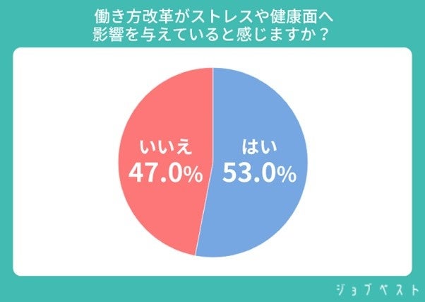 「働き方改革がストレスや健康面へ影響を与えていると感じますか」と質問すると、53%の方が「はい」と回答しました。