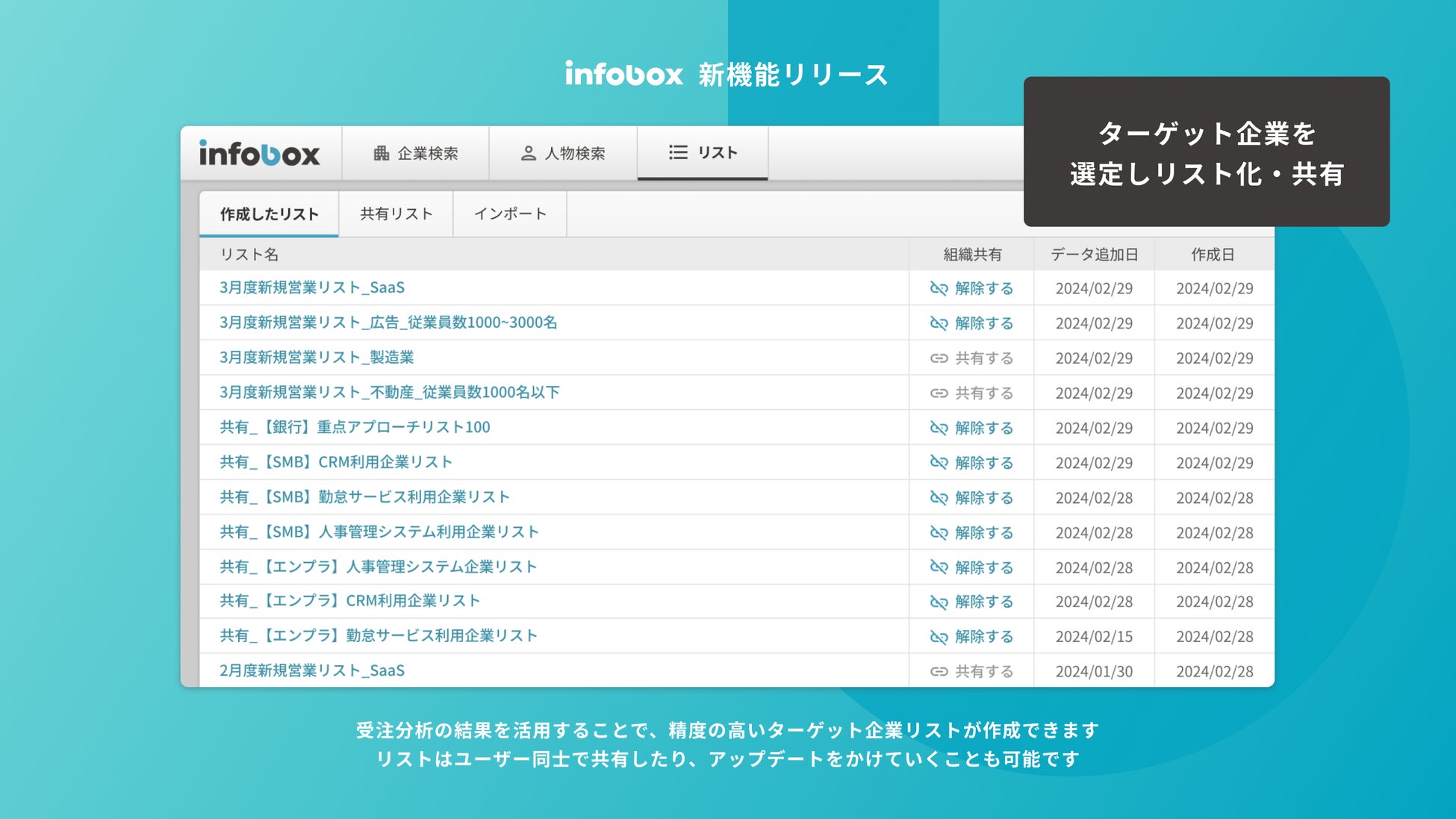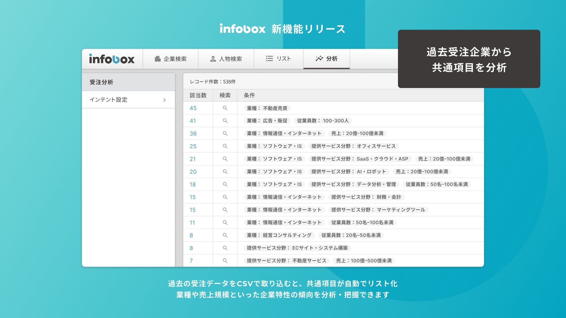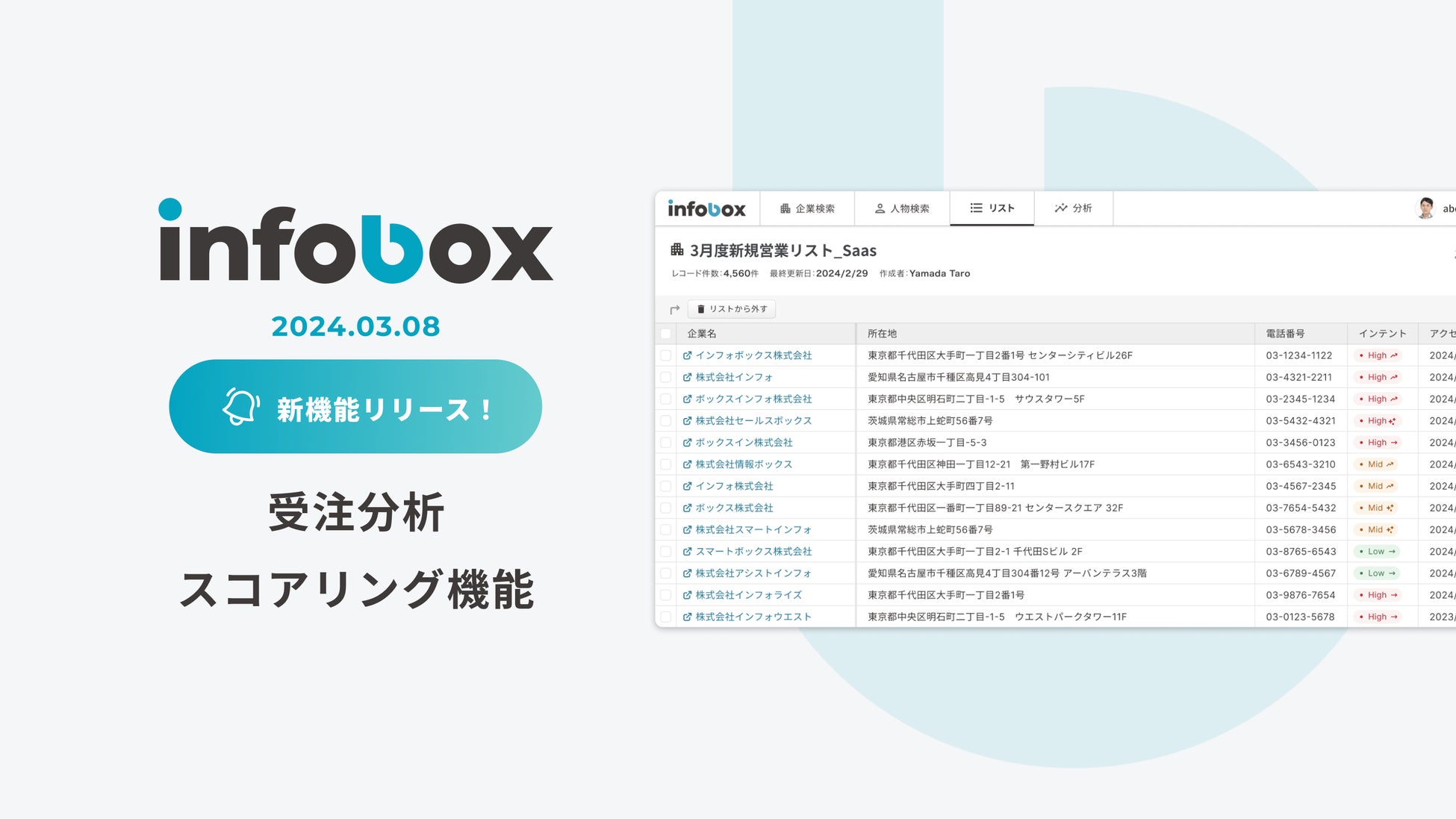 営業データプラットフォーム 「infobox」を提供する株式会社インフォボックス(本社:東京都千代田区、代表取締役:平沼海統)は、2023年2月に新機能をリリースしました。今回のリリースによって、過去受注企業の分析、ターゲット企業の選定、スコアリングを元にしたアプローチまでが、infobox上にて一気通貫で実現します。