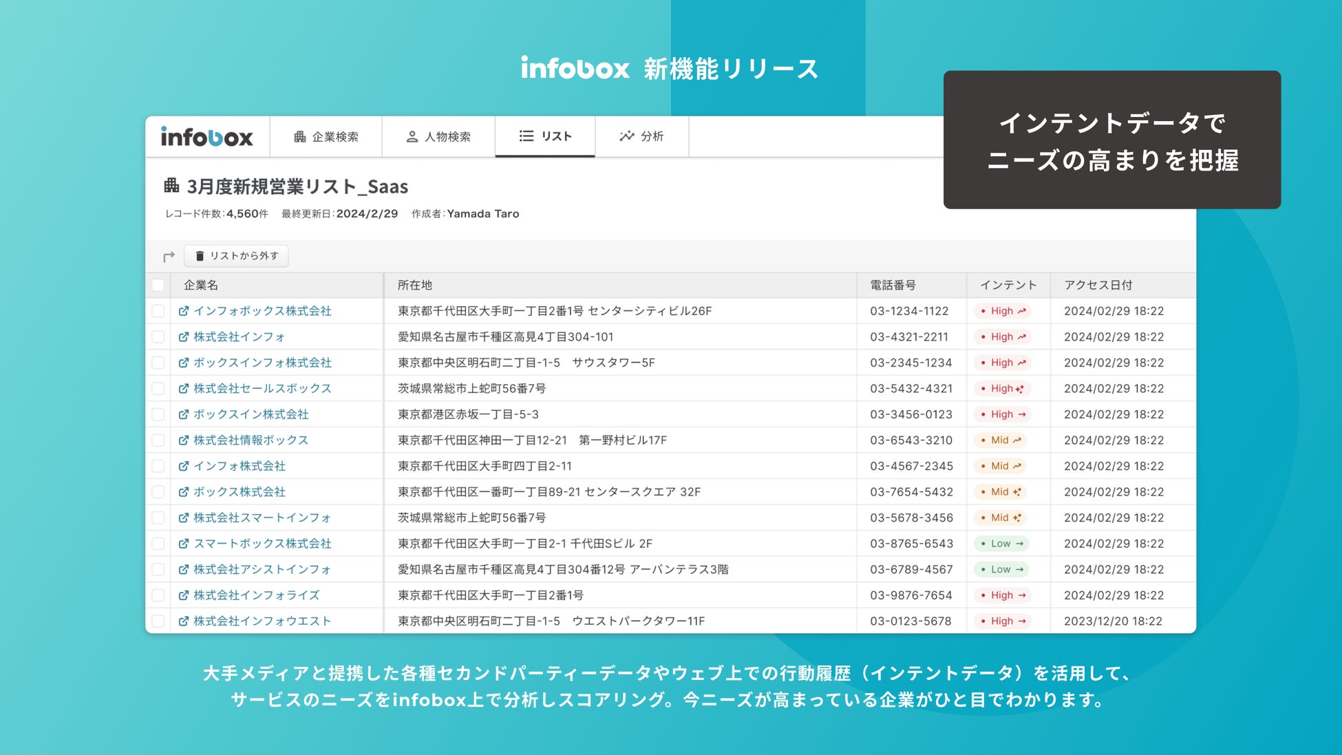 大手メディアと提携した各種セカンドパーティーデータ、ウェブ上での行動履歴(インテントデータ)を活用して、サービスのニーズをinfobox上で分析しスコアリング。今ニーズが高まっている企業がひと目でわかります。