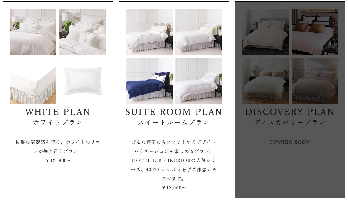 順次登場予定の「ディスカバリープラン」は、より寝心地にこだわり、ご自身の好みにフィットするリネンを発見できるプランです。公式サイトにて順次情報を公開いたします。発表まで、どうぞ楽しみにお待ちくださいませ。