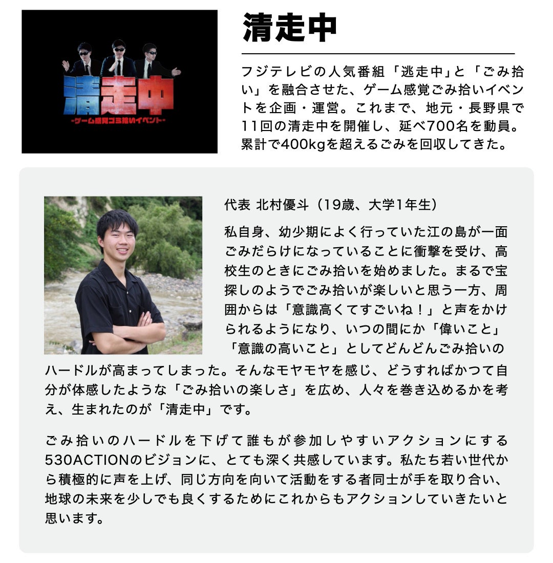 フジテレビの人気番組「逃走中」と「ごみ拾い」を融合させた、ゲーム感覚ごみ拾いイベントを企画・運営。これまで、地元・長野県で11回の清走中を開催し、延べ700名を動員。累計で400kgを超えるごみを回収してきた。