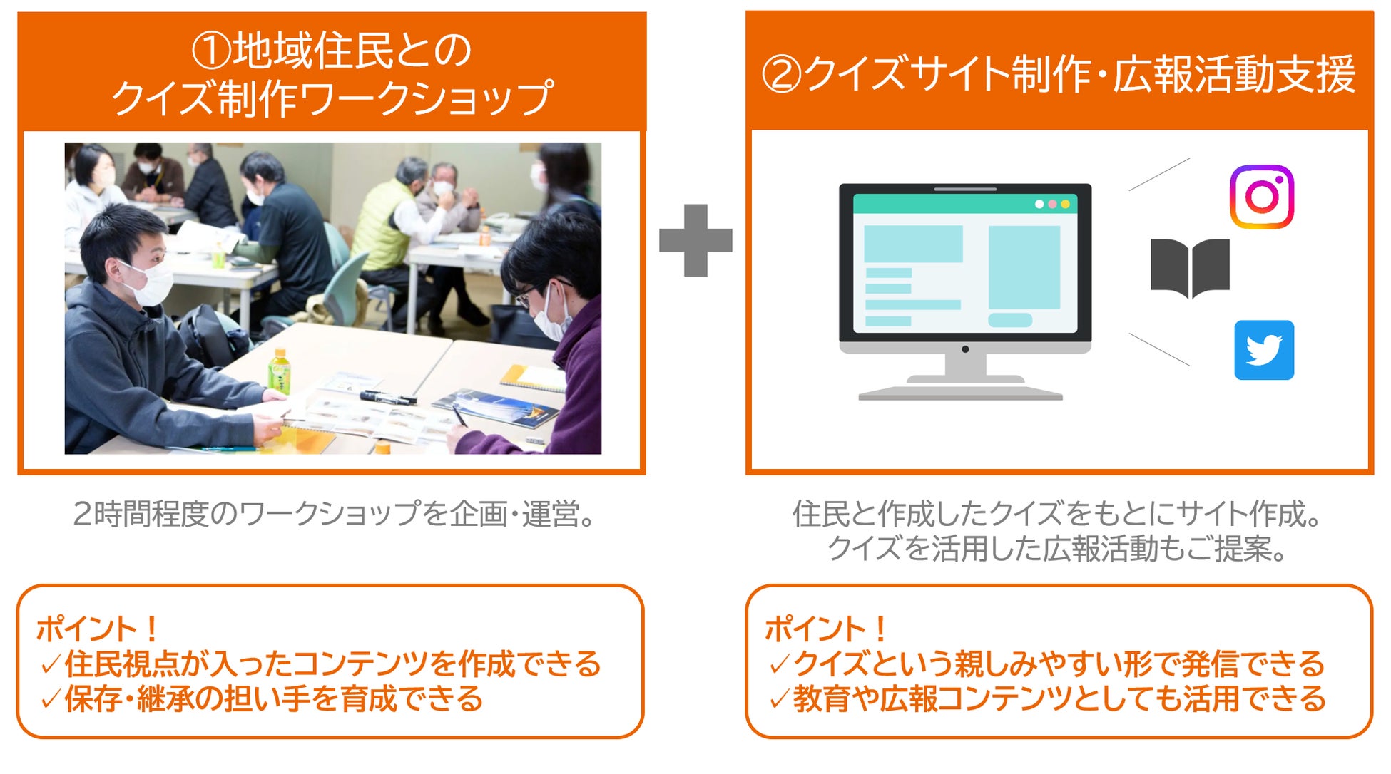 地域資源の保存・継承の担い手を増やしながら、楽しいコンテンツで認知や拡散を目指すこのメニューで、当社の考える「ひとを動かすデジタルアーカイブ」の理念や工程を体験して頂ければと思います。