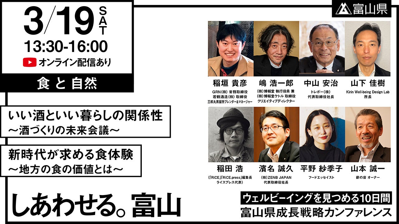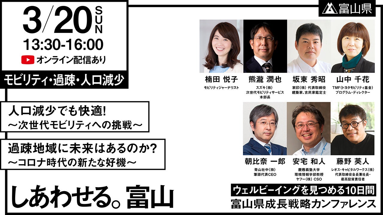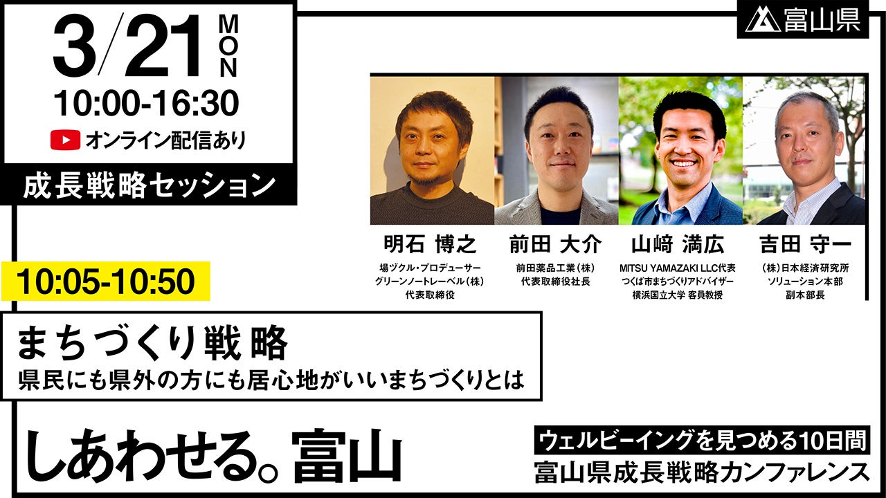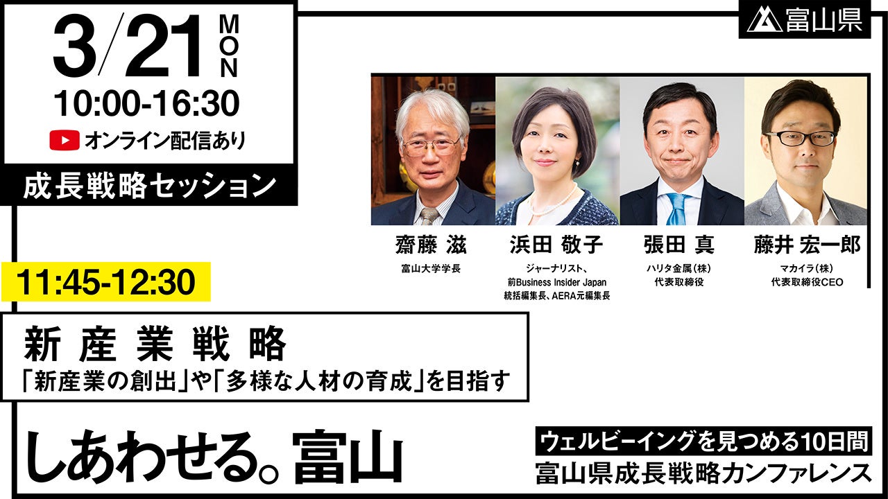 富山県成長戦略の実現に向け富山で暮らす人はもちろんのこと、富山で仕事する人、生まれ育った人、愛着を持って関わる全ての人を富山の仲間として迎え、「富山県成長戦略」について語り合うトークセッションを開催します。