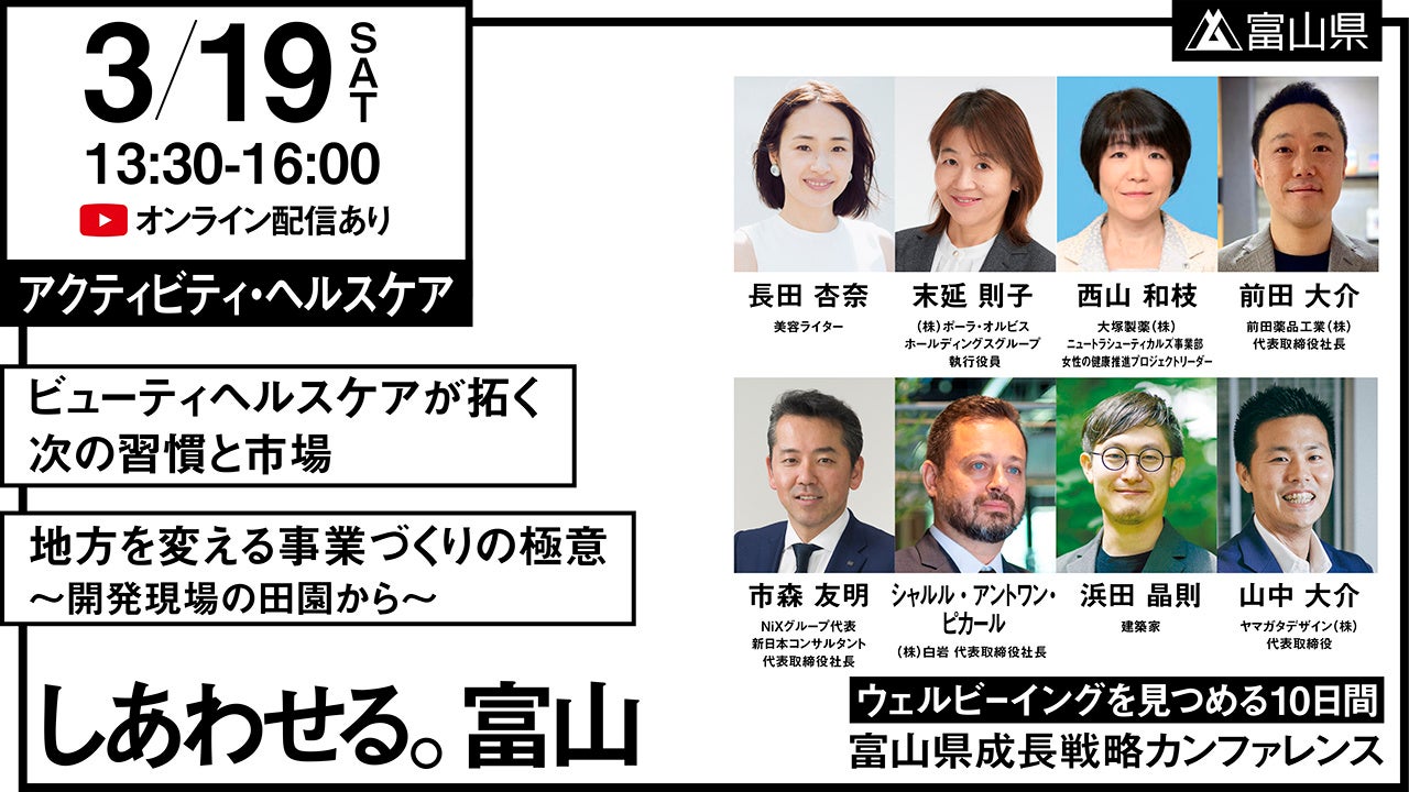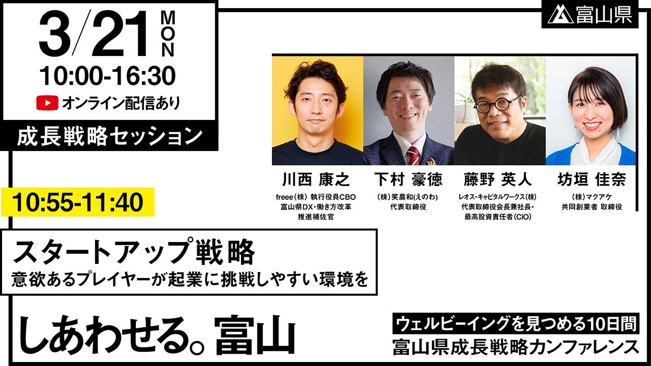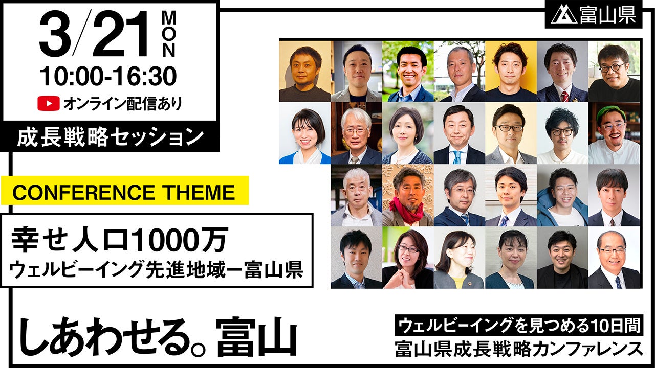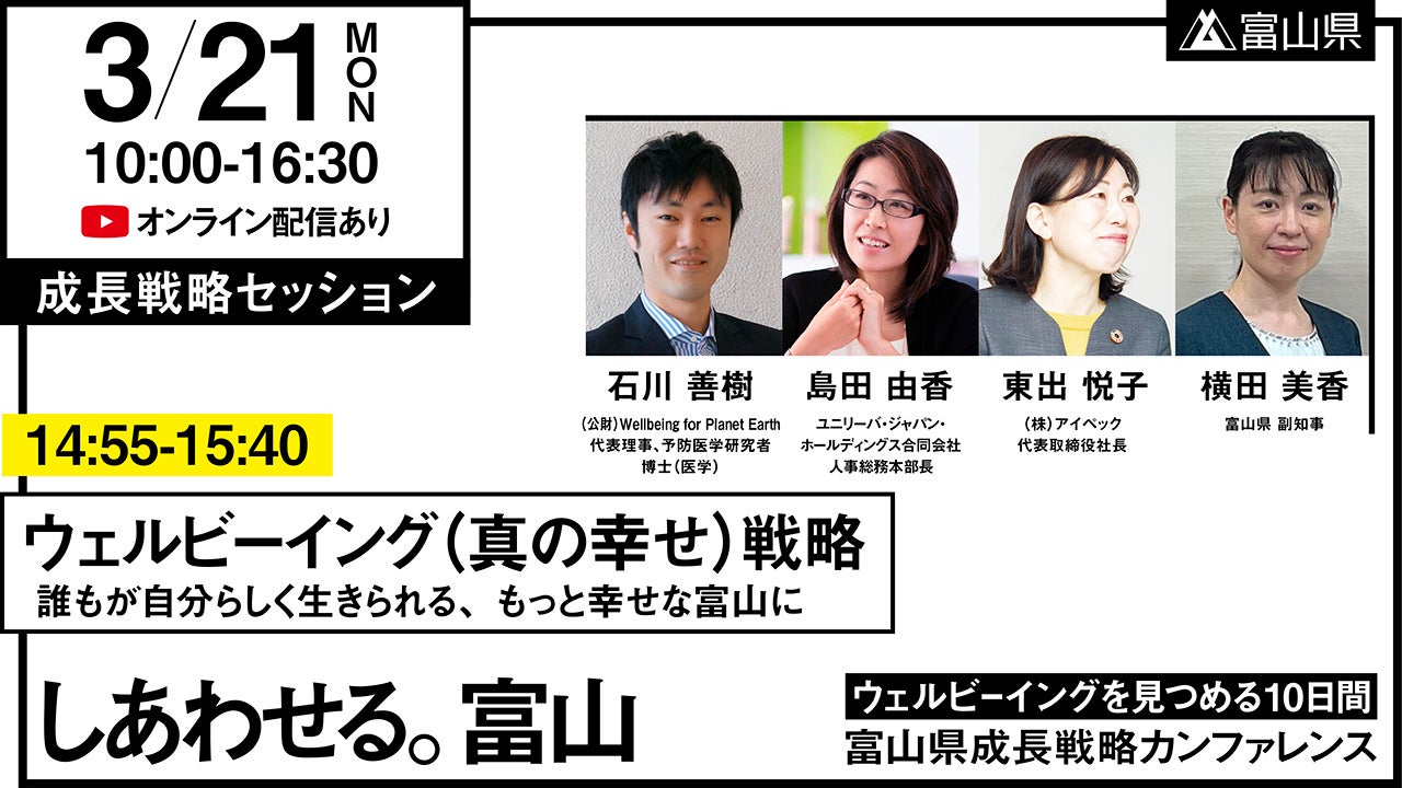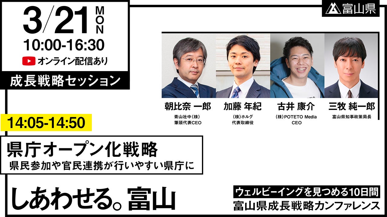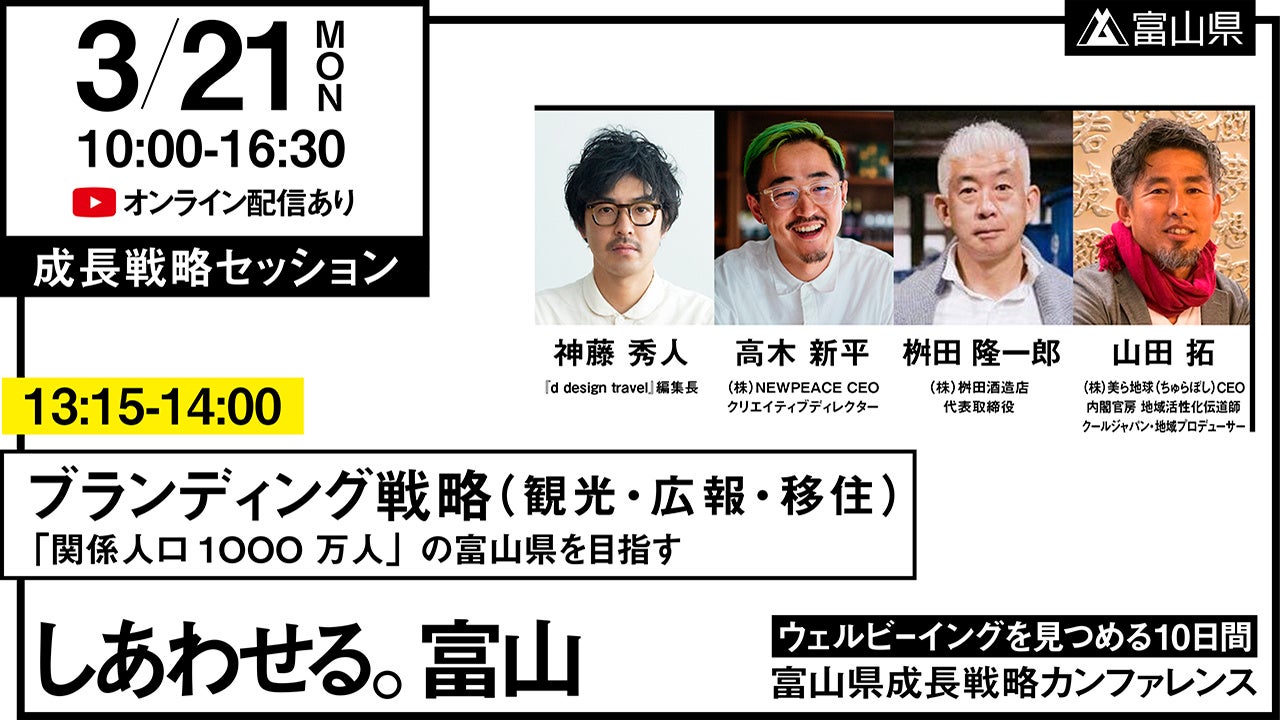 株式会社ニューピース(代表取締役:高木新平)では代表の高木新平が富山県成長戦略会議委員を務めています。このたび、成長戦略の発信と実現に向けて、富山県成長戦略カンファレンス「しあわせる。富山 -ウェルビーイングを見つめる10日間-」(富山県事業)が3月12日(土)から21日(月・祝)にかけて開催され、12日(土)のオープニングセッション、21日(月・祝)の成長戦略セッションに高木新平が登壇します。
