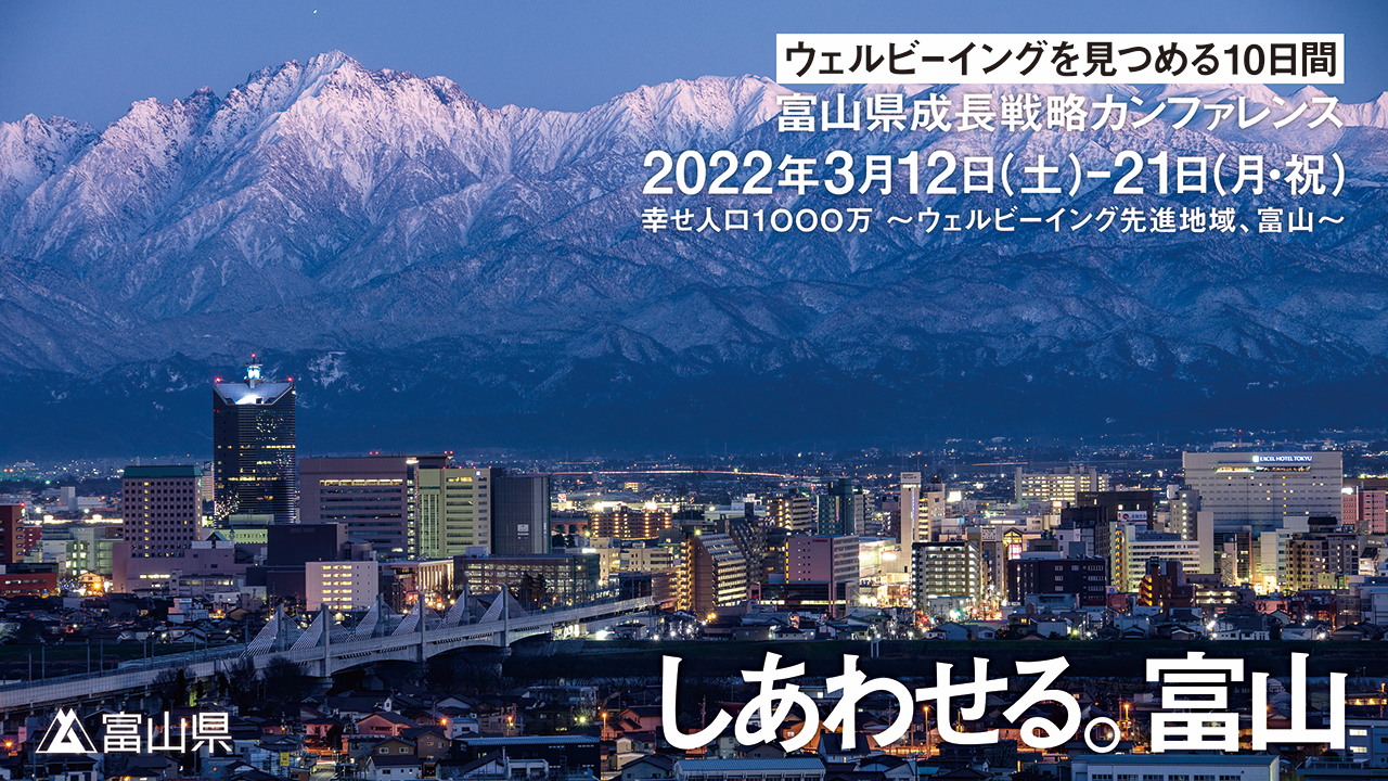 富山県では、2021年2月から新しい富山の更なる発展に向け、富山にゆかりのある外部委員を県内外から招いて「富山県成長戦略会議」を発足し、新時代の成長戦略のキーワードを、「真の幸せ(ウェルビーイング)」とし、議論を重ねてきました。富山県は全国でも幸福度が高いと言われており、豊かな自然や水、おいしい食など、幸せの基盤が揃う地域です。これからの時代に、次世代の価値を産む人が育ち集まる富山となるため「幸せ人口1000万 〜ウェルビーイング先進地域、富山〜」を成長戦略のビジョンに掲げました。