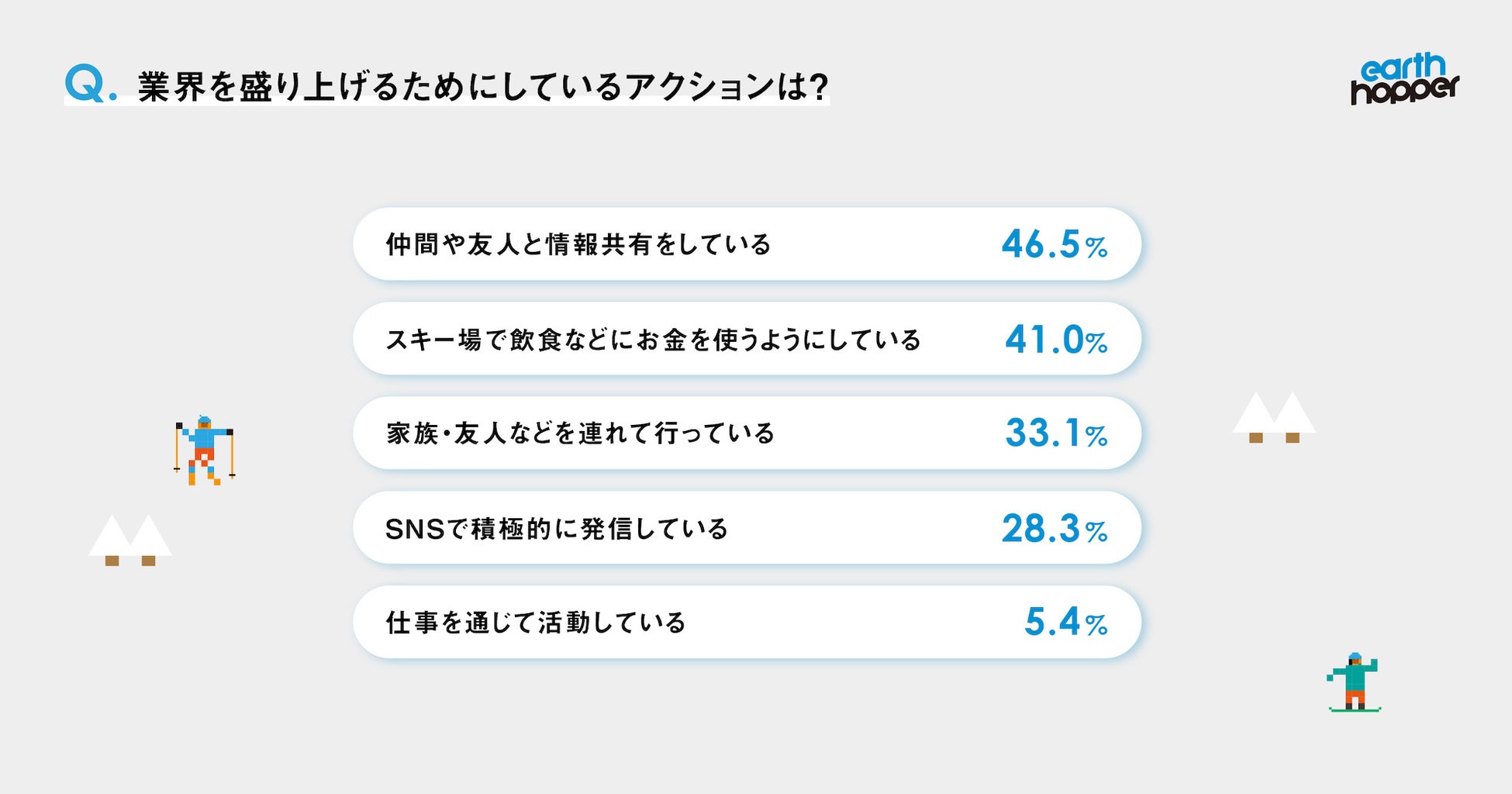 業界を盛り上げるためにしているアクションはある?(複数回答)という質問には、「仲間や友人と情報共有」46.5%、「スキー場で飲食などにお金を使う」41.0%の他、たくさんの熱い自由記述回答が集まりました。以下はその一例です。