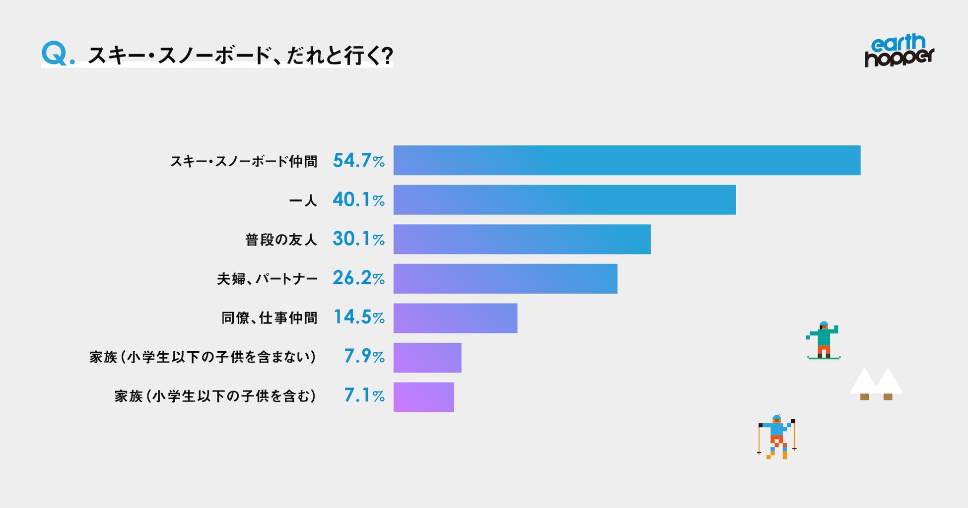 - 一緒に行くのは「スキー・スノーボード仲間」54.7%、「一人」40.1%