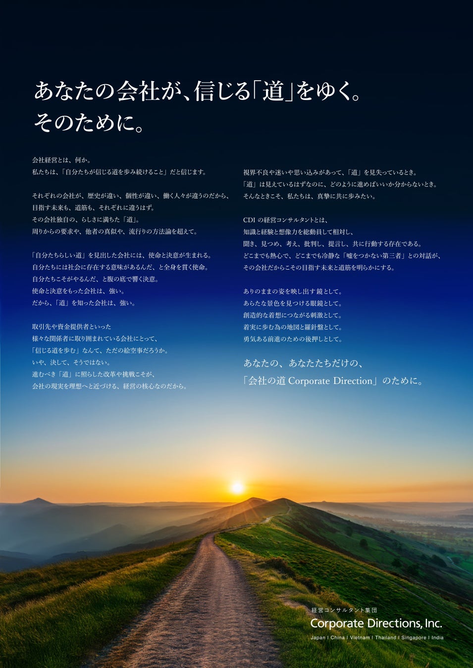 1986年に日本初の独立系経営戦略コンサルティングファームとして創業したコーポレイトディレクション(CDI)は、第40期目となる今年に、タグライン&ステートメントを新たに策定いたしました。