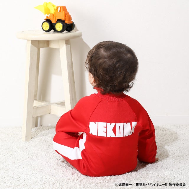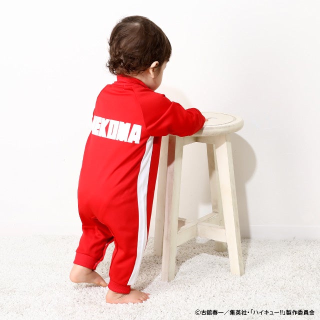 烏野高校と音駒高校のジャージをイメージしたベビー用ロンパースは、胸元のロゴとバックプリントがポイント。