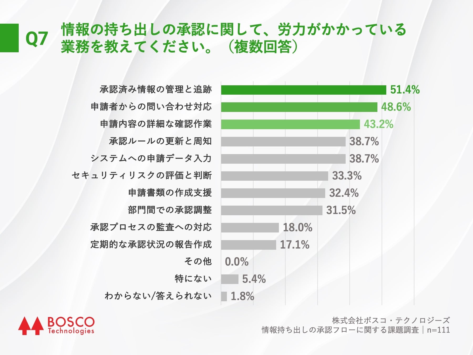 「Q7.情報の持ち出しの承認に関して、労力がかかっている業務を教えてください。(複数回答)」(n=111)と質問したところ、「承認済み情報の管理と追跡」が51.4%、「申請者からの問い合わせ対応」が48.6%、「申請内容の詳細な確認作業」が43.2%という回答となりました。