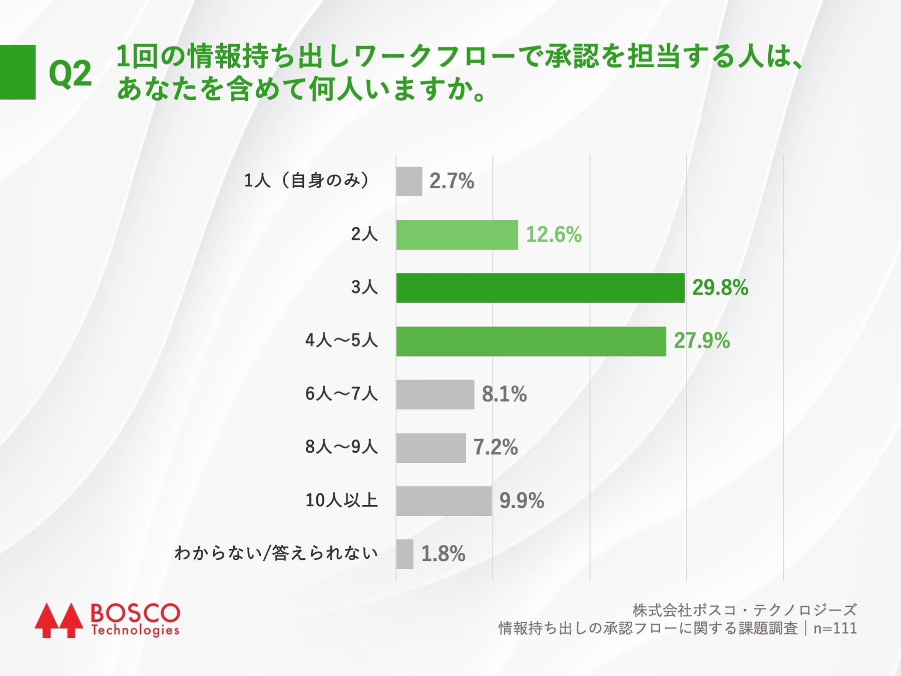 株式会社ボスコ・テクノロジーズ(本社:東京都港区、代表取締役:林 經正)は、情報持ち出しに関するセキュリティ対策を実施し、承認ワークフローを導入している企業にて、情報持ち出しの申請を承認する情報システム担当者111名を対象に、情報持ち出しの承認フローに関する課題調査を実施しましたので、お知らせいたします。