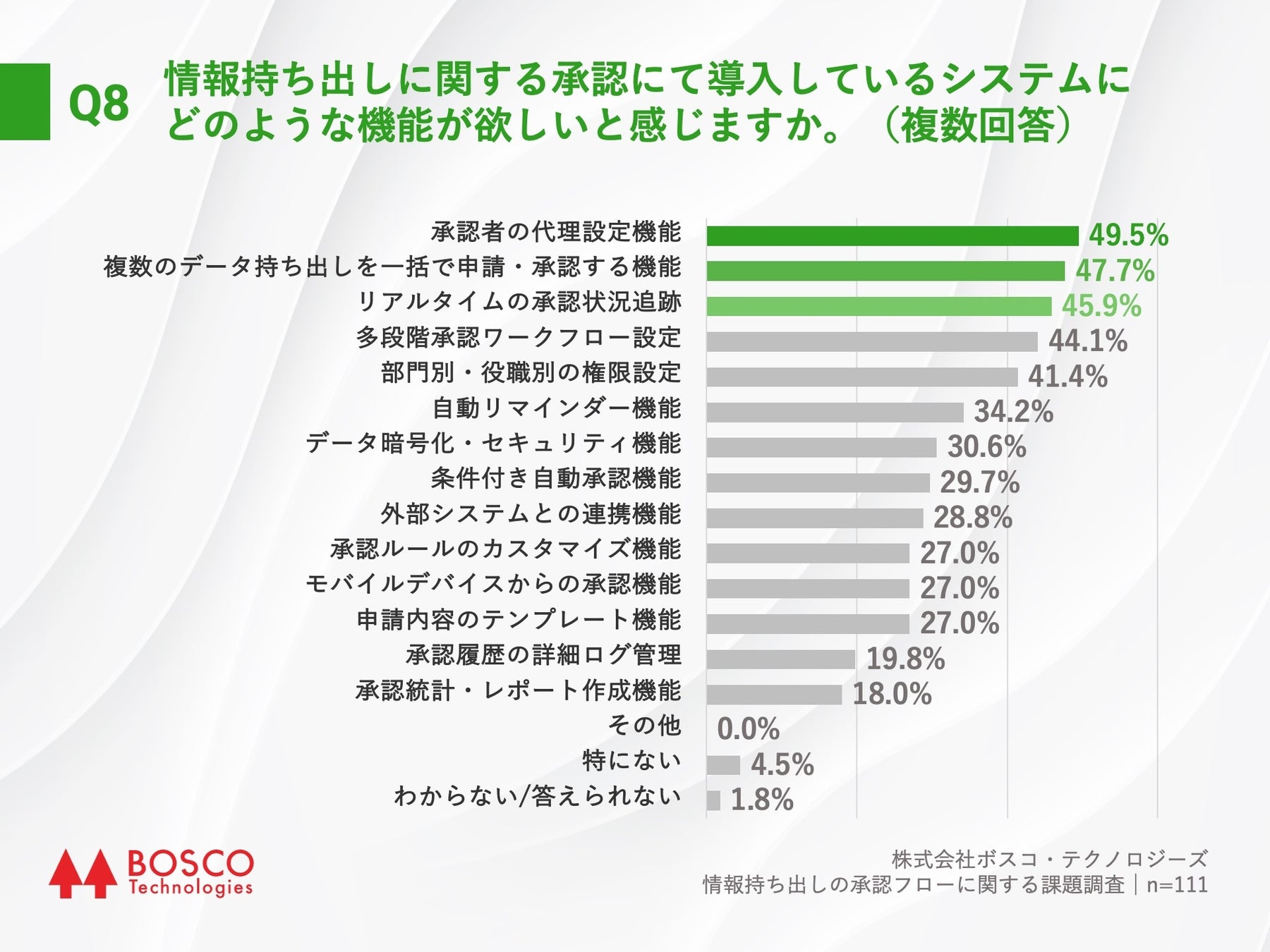 「Q8.情報持ち出しに関する承認にて導入しているシステムにどのような機能が欲しいと感じますか。(複数回答)」(n=111)と質問したところ、「承認者の代理設定機能」が49.5%、「複数のデータ持ち出しを一括で申請・承認する機能」が47.7%、「リアルタイムの承認状況追跡」が45.9%という回答となりました。