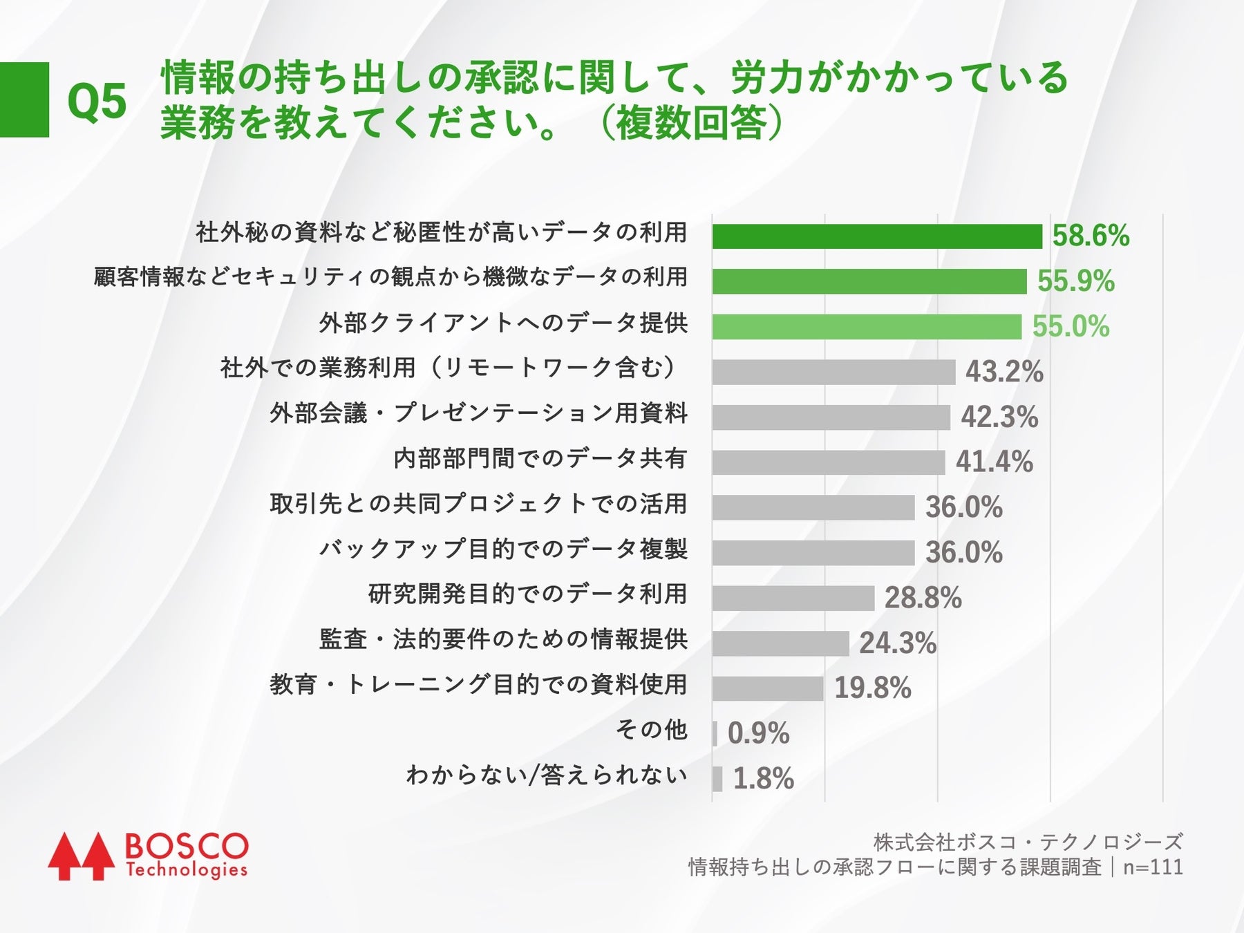 「Q5.情報持ち出しに関する申請の内容はどのようなものですか。(複数回答)」(n=111)と質問したところ、「社外秘の資料など秘匿性が高いデータの利用」が58.6%、「顧客情報などセキュリティの観点から機微なデータの利用」が55.9%、「外部クライアントへのデータ提供」が55.0%という回答となりました。