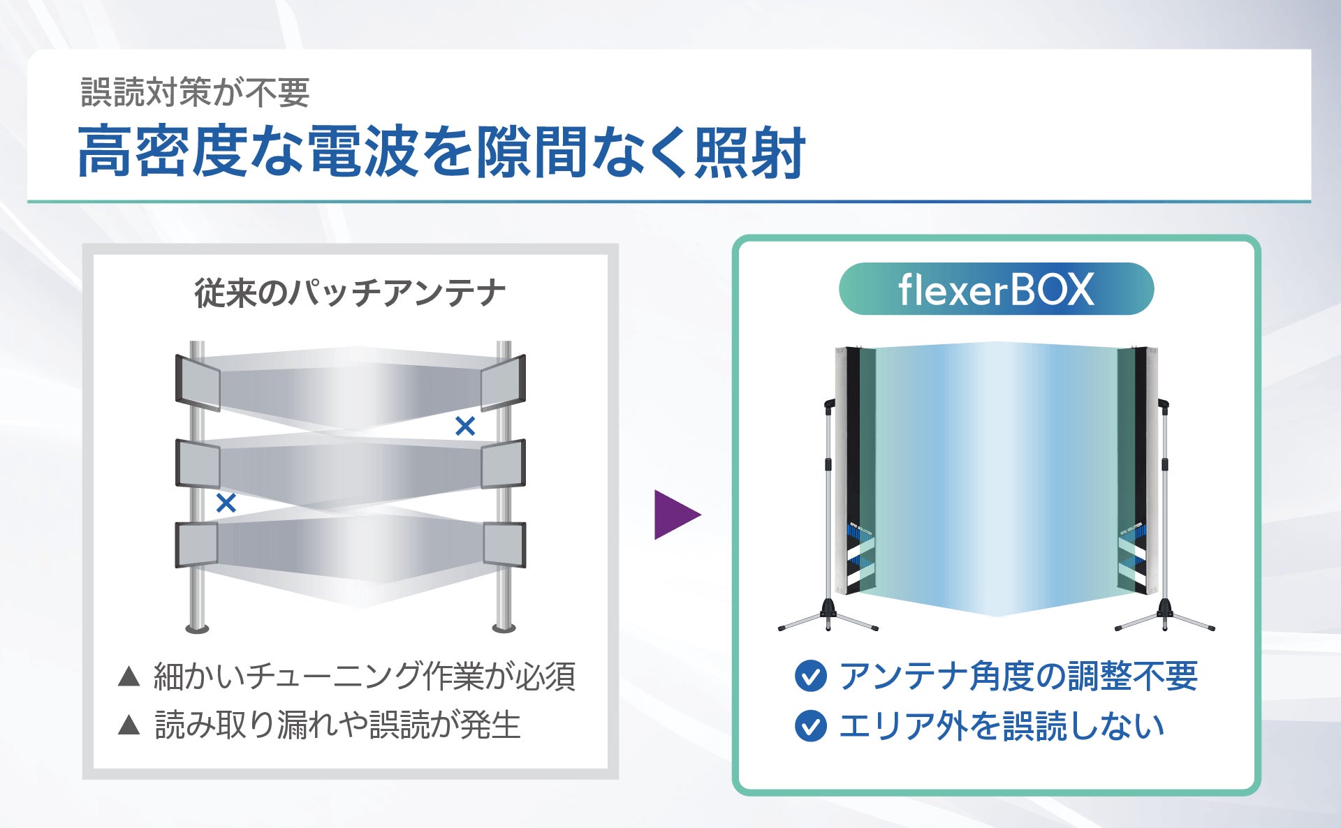 ■読み取り精度の課題を解決する「スマートRFIDアンテナシリーズ」から新ラインアップ登場。設置の自由度を高めた「flexerBOX」。