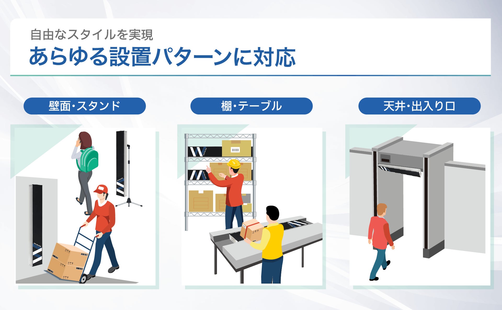 従来のゲートタイプアンテナとして、対象物の通過を検知します。物流現場における入荷検品業務への省スペース導入を実現できるほか、人が往来するエントランスでの入退場管理や受付業務など、店舗や公共施設への導入も可能です。