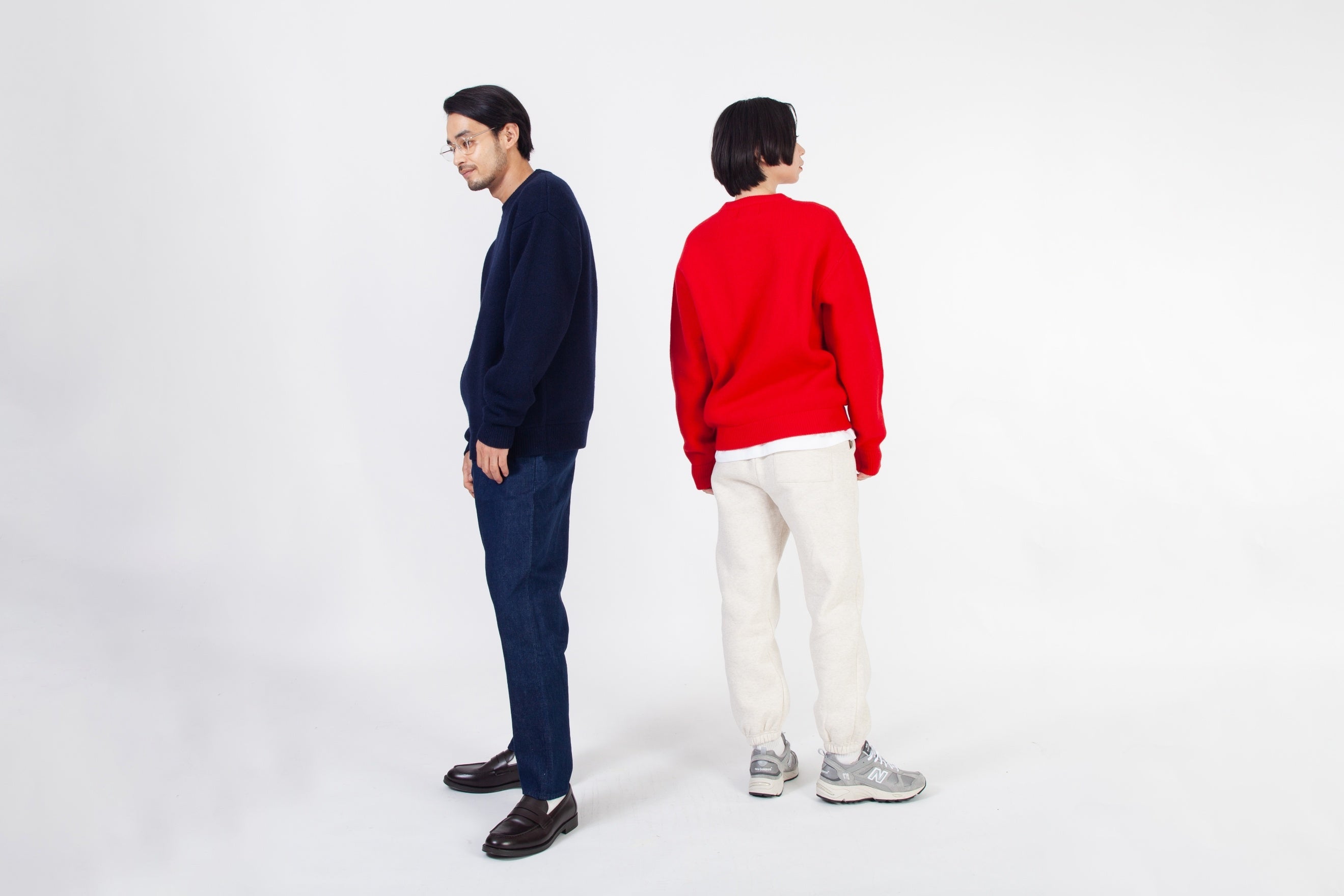 「吊り編み機」同様、希少な旧式編み機「あずま編み機」を用いたヘビーウェイトな一着。ゆっくりと時間をかけて編み立てる生地は、膨らみのある柔らかい生地感で、袖を通すのが楽しくなる着心地の良さが特徴です。裏起毛仕様なので、保温性にも優れています。