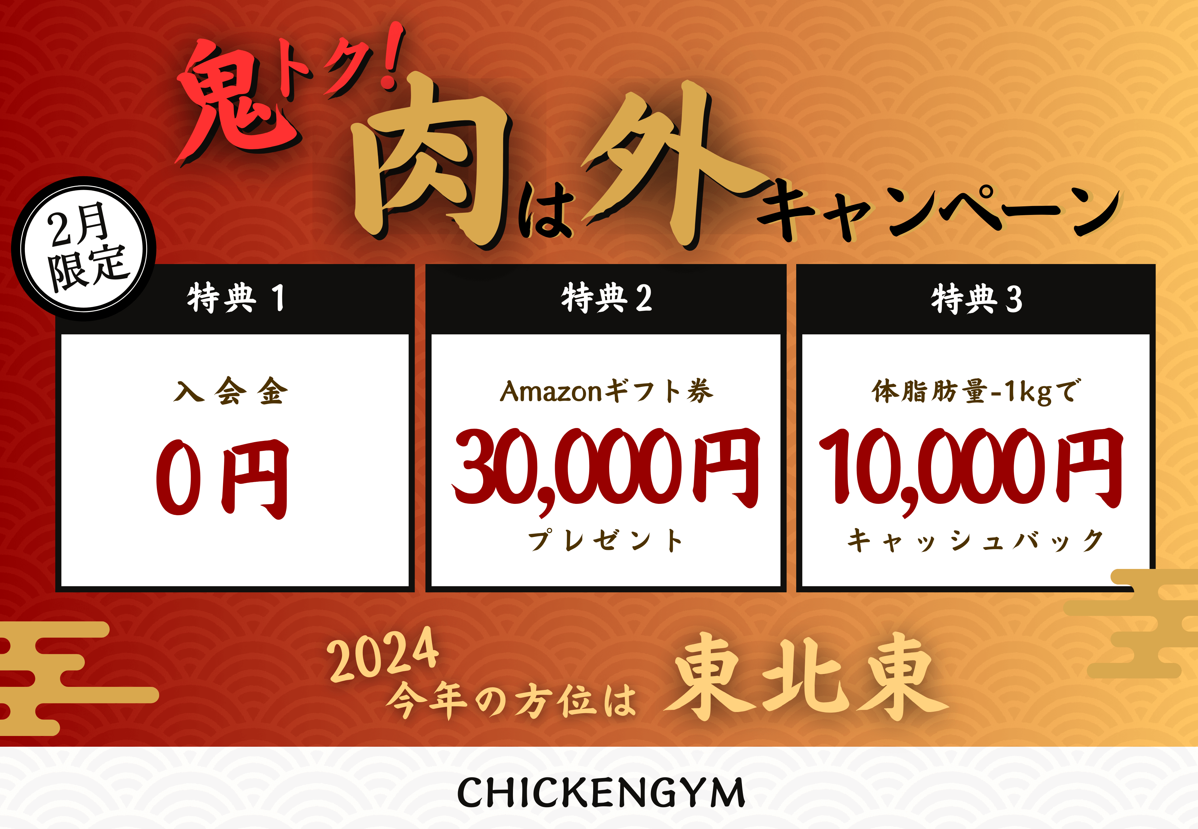 【節分】パーソナルジム チキンジムで1年の無病息災を願おう 最大85,000円お得な「鬼トク!肉は外キャンペーン」開催決定