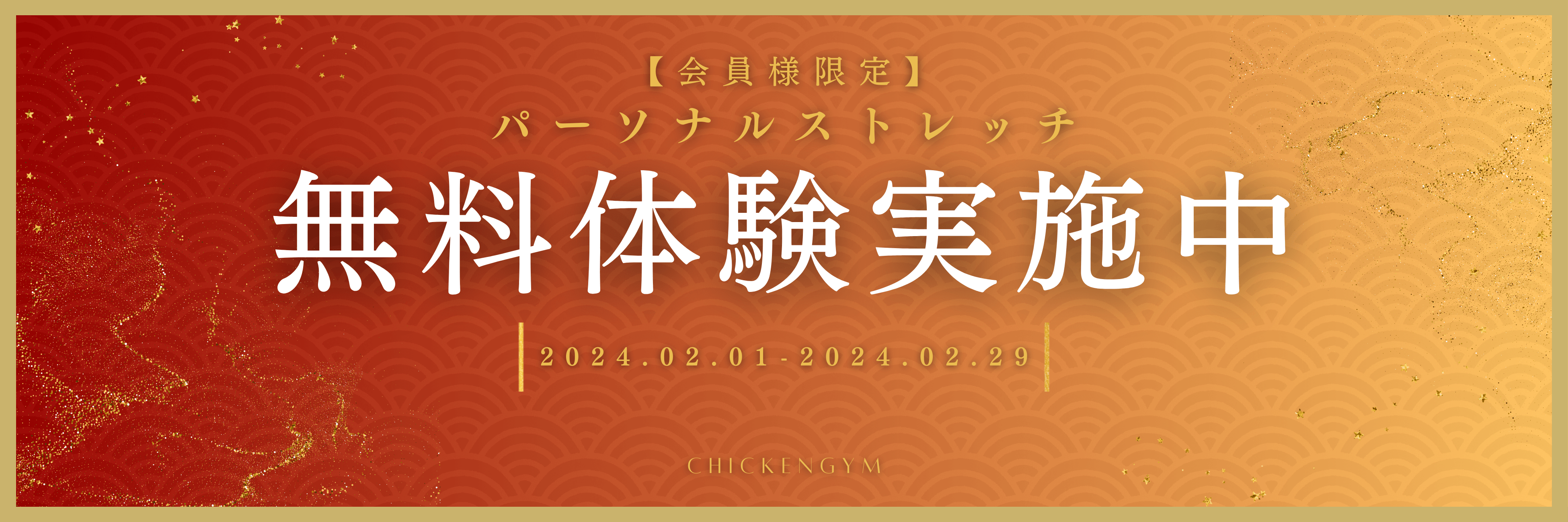 パーソナルストレッチを取り入れ、トレーニング効果を高め、お通い頂いている皆様により一層の実感を得ていただきたいという思いから、チキンジムではパーソナルストレッチの無料体験を開催を決定いたしました。