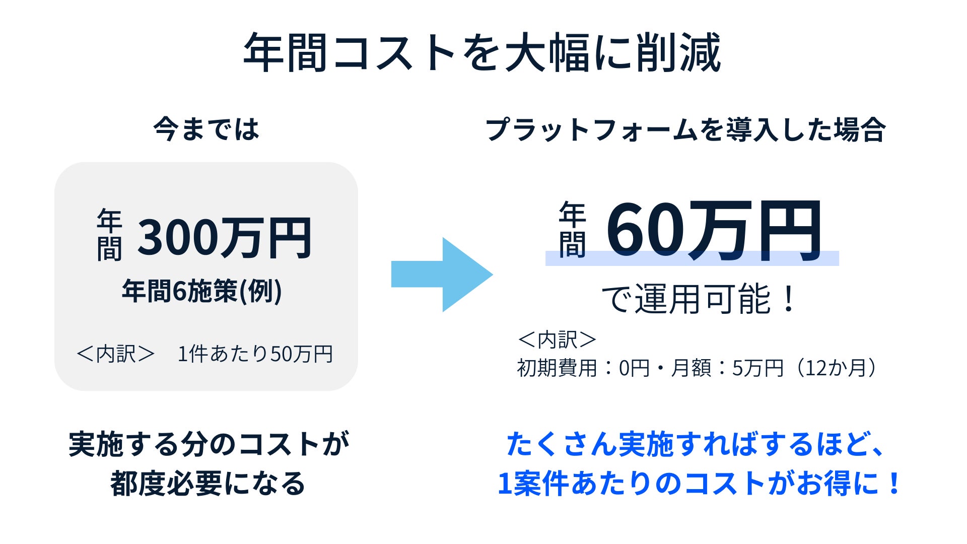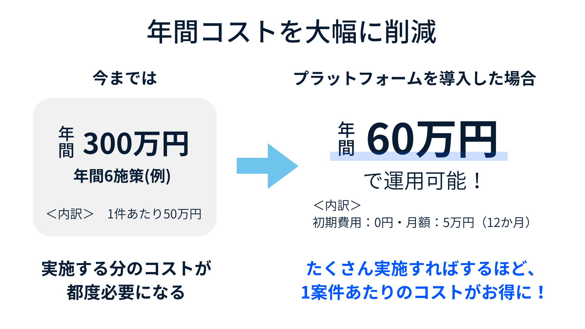 キャンペーンを実施すればするほど1件当たりのコストがお得になり、年間コストを大幅に削減できます。