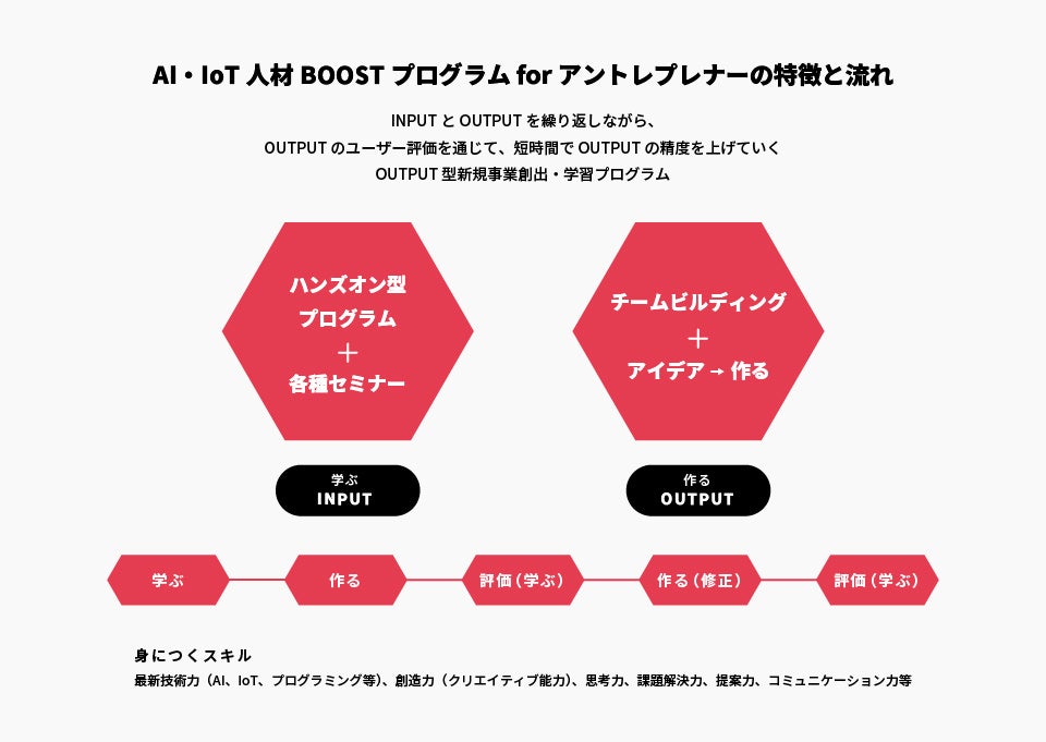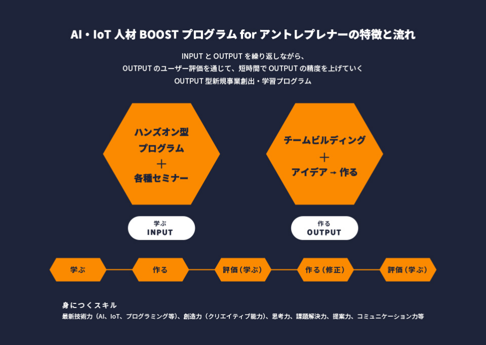 本プログラムは、学習だけで終わることなく、インプットとアウトプットを繰り返しながら、アウトプットに対するユーザー評価を通じて、短期間でアウトプットの精度を上げていく「アウトプット型 新規事業創出・学習プログラム」です。