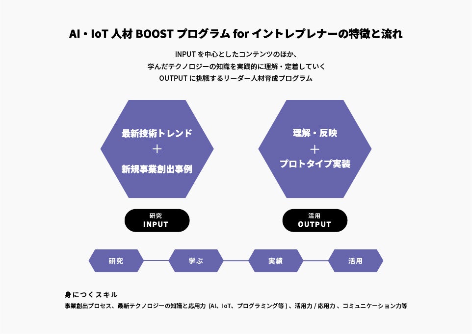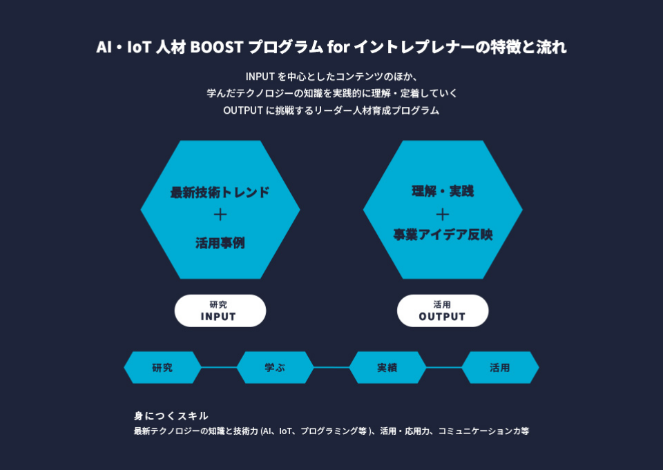 「AI・IoT人材BOOSTプログラム」では、起業家(アントレプレナー)向けと社内新規事業担当者(イントレプレナー)向けの2コースをご用意し、本日より参加者募集を開始いたします。