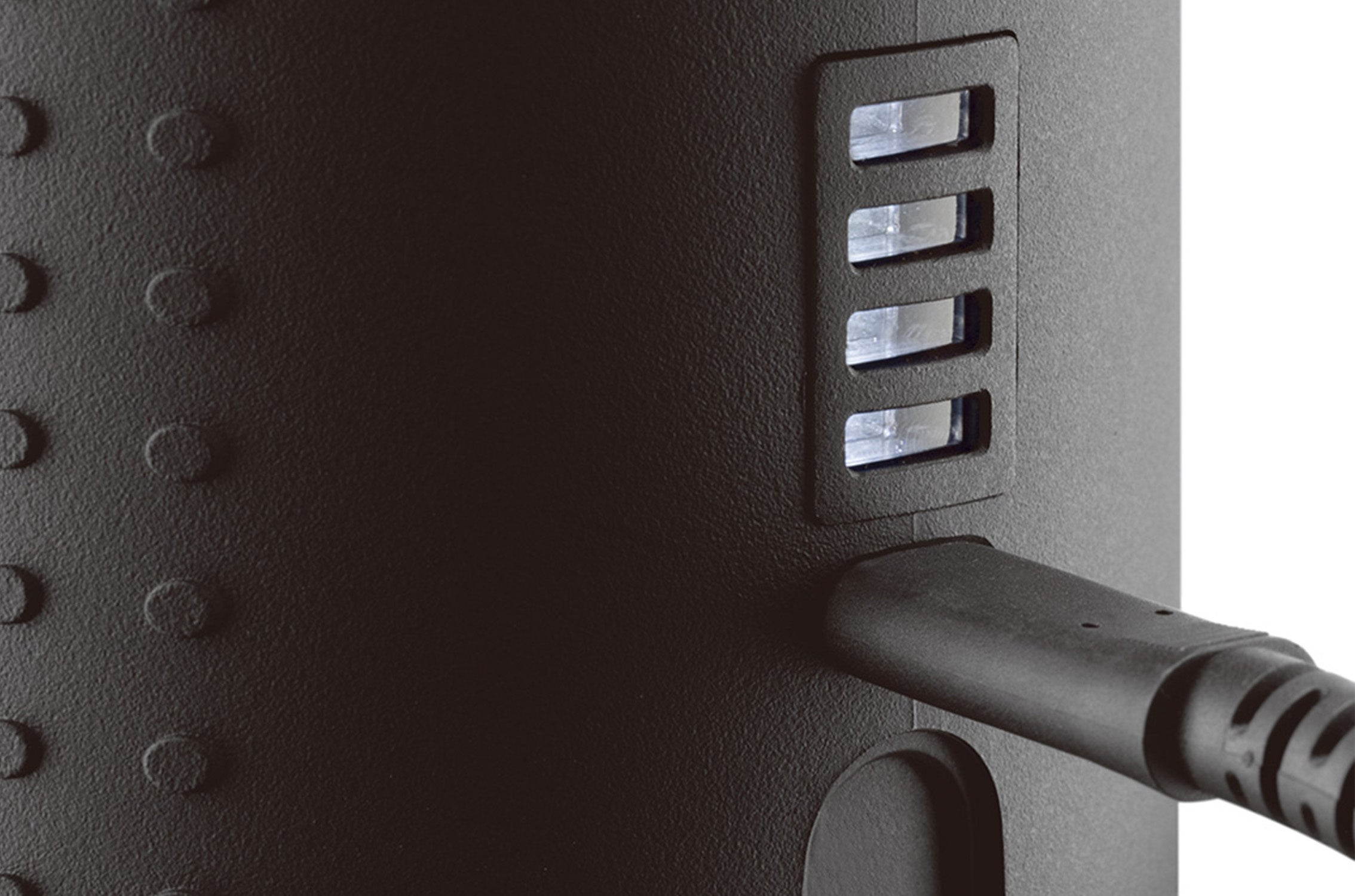 ・ LEDランプがバッテリー残量を表示。(フル充電時に4つのLEDランプがすべて点灯)