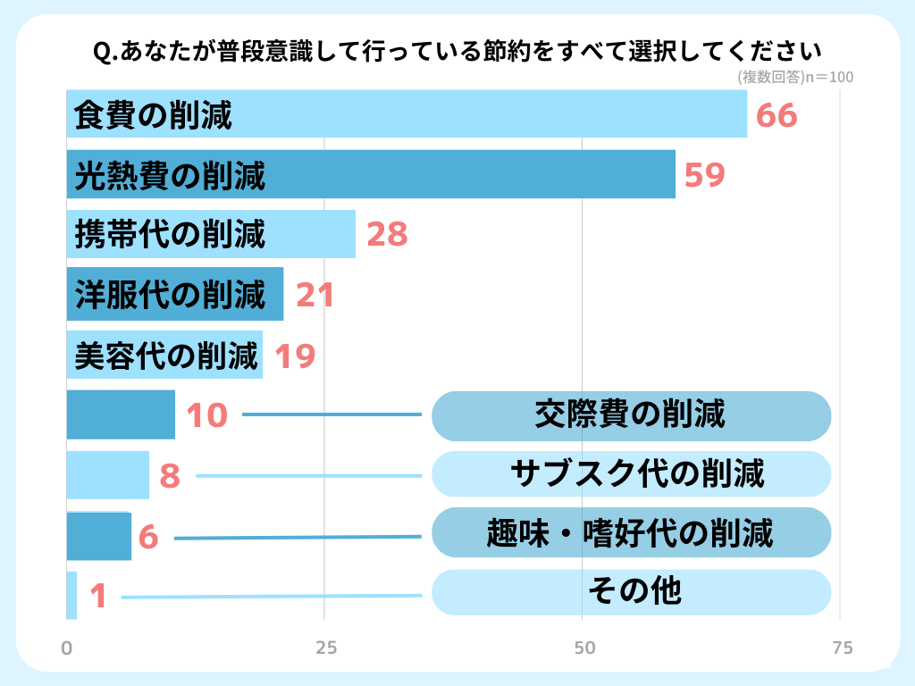 調査の結果、趣味や交際費よりも食費の節約に取り組んでいる人が多いことが伺えました。