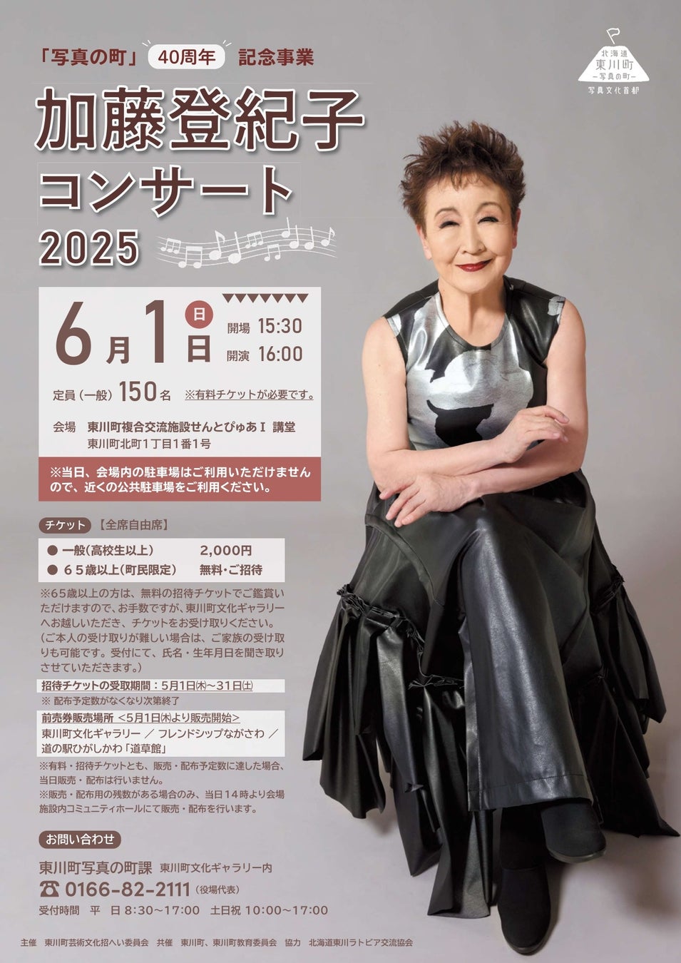 「写真の町」の 40 周年のお祝いに、加藤登紀子さんが駆けつけて くれます。65 歳以上の町民はご招待いたしますので、ぜひ加藤 登紀子さんと 40 周年をお祝いしましょう。