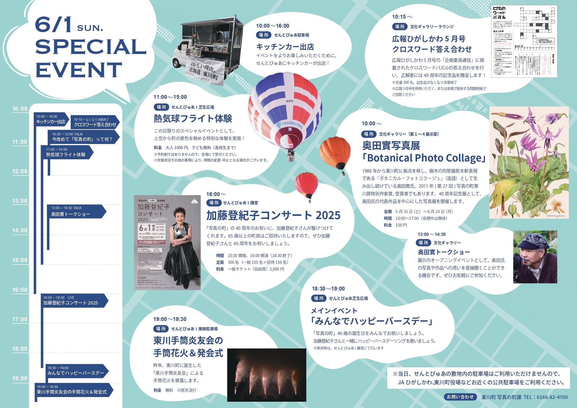 東川町文化ギャラリーでは、町内在住の写真家奥田實さんの写真展&トークショー、広報5月号に掲載されたクロスワードの答え合わせ、「写真の町40周年記念誌」発行に合わせたトークイベントが開催されます。また、東川町複合交流施設せんとぴゅあでは、熱気球フライト体験、キッチンカー出店、加藤登紀子コンサート、東川手筒花火炎友会による手筒花火が開催されます。
