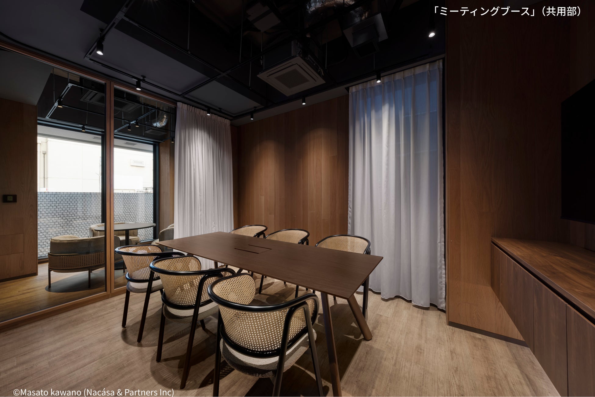 ラウンジに隣接して設けたミーティングブースは、ガラスパーテーションにより開放感を保ちつつ、カーテンによって必要なプライバシーを確保できる設計です。完全予約制のシステムにより、採用面接や社内ミーティング、来客対応など、あらゆるシーンで効率的に利用できます。