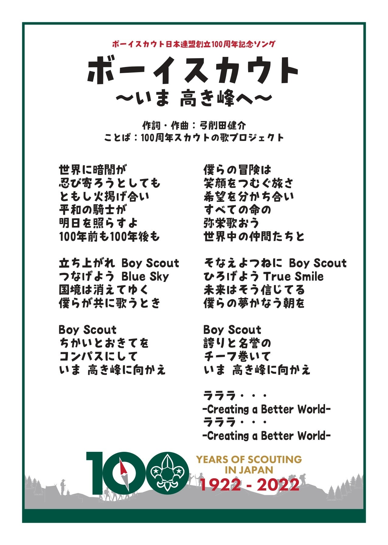 ボーイスカウトの活動において、楽しさや喜びを仲間と共有・共感するため、また、スカウト精神に触れることができる身近なツールとして、「歌」は欠かせないものです。100周年を機に、加盟員およびその保護者から、歌詞につながる「ことば」を募集し、それをもとに作詞作曲を弓削田健介氏に依頼しました。ボーイスカウトの楽しさや魅力、そしてどんな大人になりたいか、どんな社会にしたいかという「夢」をこめた歌です。