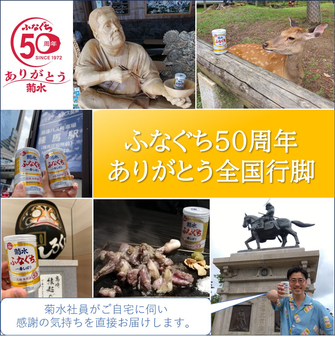 1972年11月にお客様の声がきっかけとなって誕生した「菊水ふなぐち」は、お客様が手にしてくださるひと缶ひと缶に支えられて、発売50周年を迎えることができました。この節目に立つ社員たちが、お客様に感謝の想いを直接届ける全国行脚の旅に出ています。お客様と「菊水ふなぐち」の出会いや思い出など、素敵なエピソードを綴った訪問レポートは、後日、菊水酒造オフィシャルサイトにてご紹介いたします。