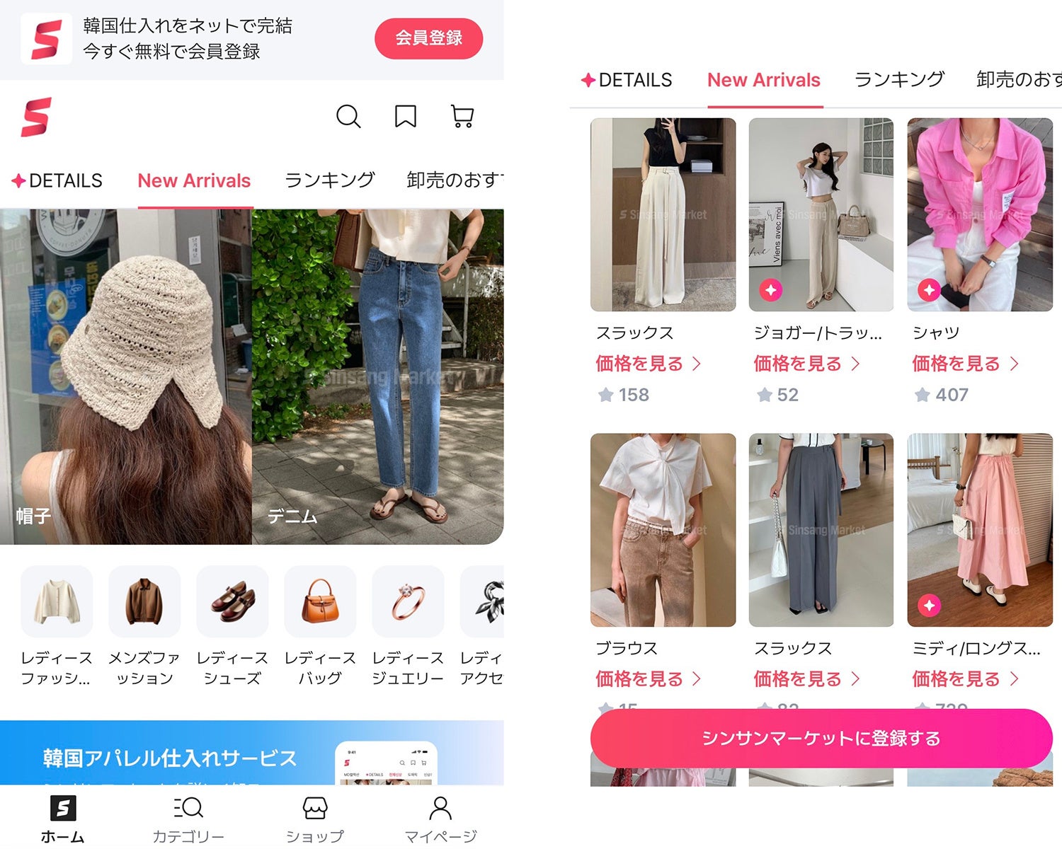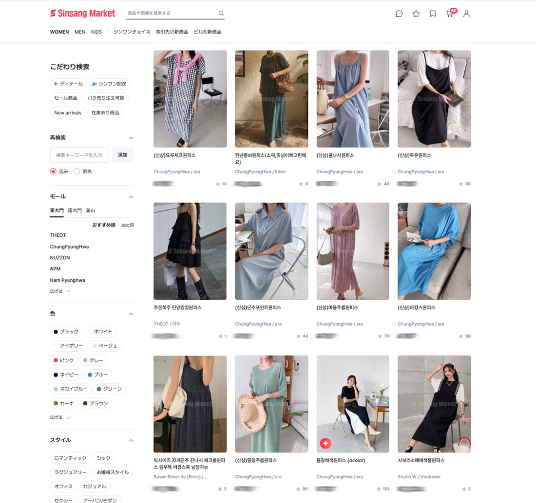 シンサンマーケットには、韓国最大のファッション卸売市場「東大門」「南大門」の新商品が毎日12,000個アップデート!東大門市場の約80%の卸売店が入店しているため、圧倒的な品揃えも魅力だ。オンラインショッピングのように仕入れができるので、初心者でも安心して利用できること、国際配送にも関わらず15,000ウォンという安価な送料もメリットのひとつ。