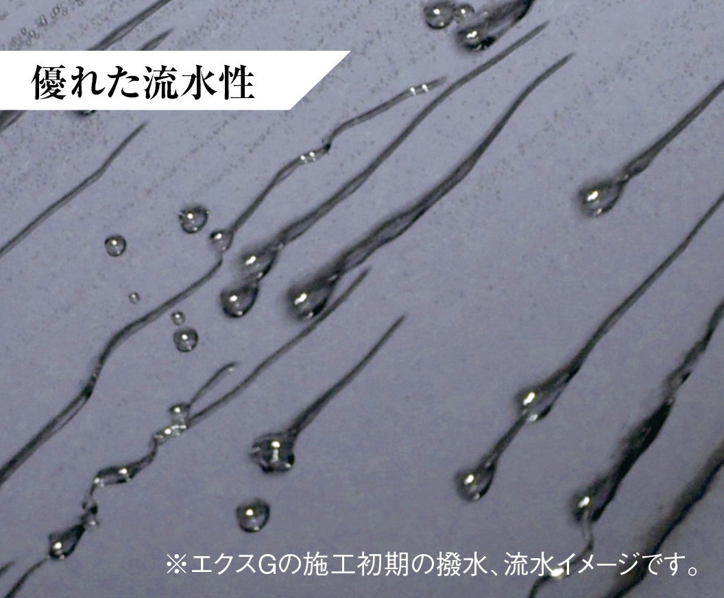 大きな特長のひとつは、新開発のコーティング剤により「滑落性」と「流水性」を大幅に高めたことで、それを「滑力(かつりょく)」と名付けました。汚れを滑り落とす「滑落性」がボディに汚れを残さず美しさを守り、水を滑り落とす「流水性」がボディに水滴を残りにくくしてシミを防ぎます。それらがボディを美しく保つ最大の要因であり、その汚れ・水を残さないチカラ「滑力(滑落性+流水性)」を飛躍的に高めたことが大きなポイントです。