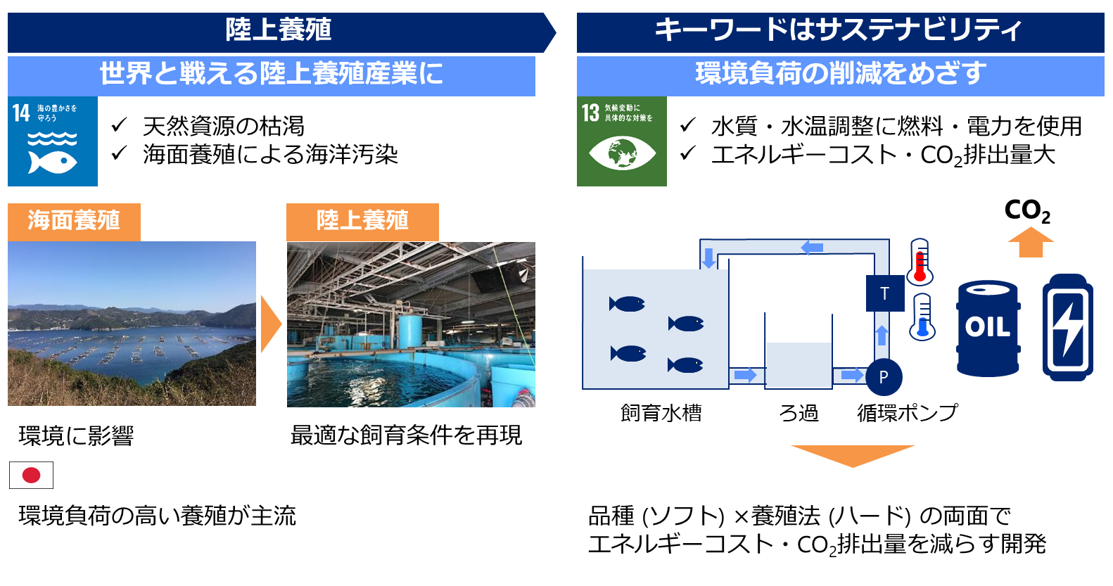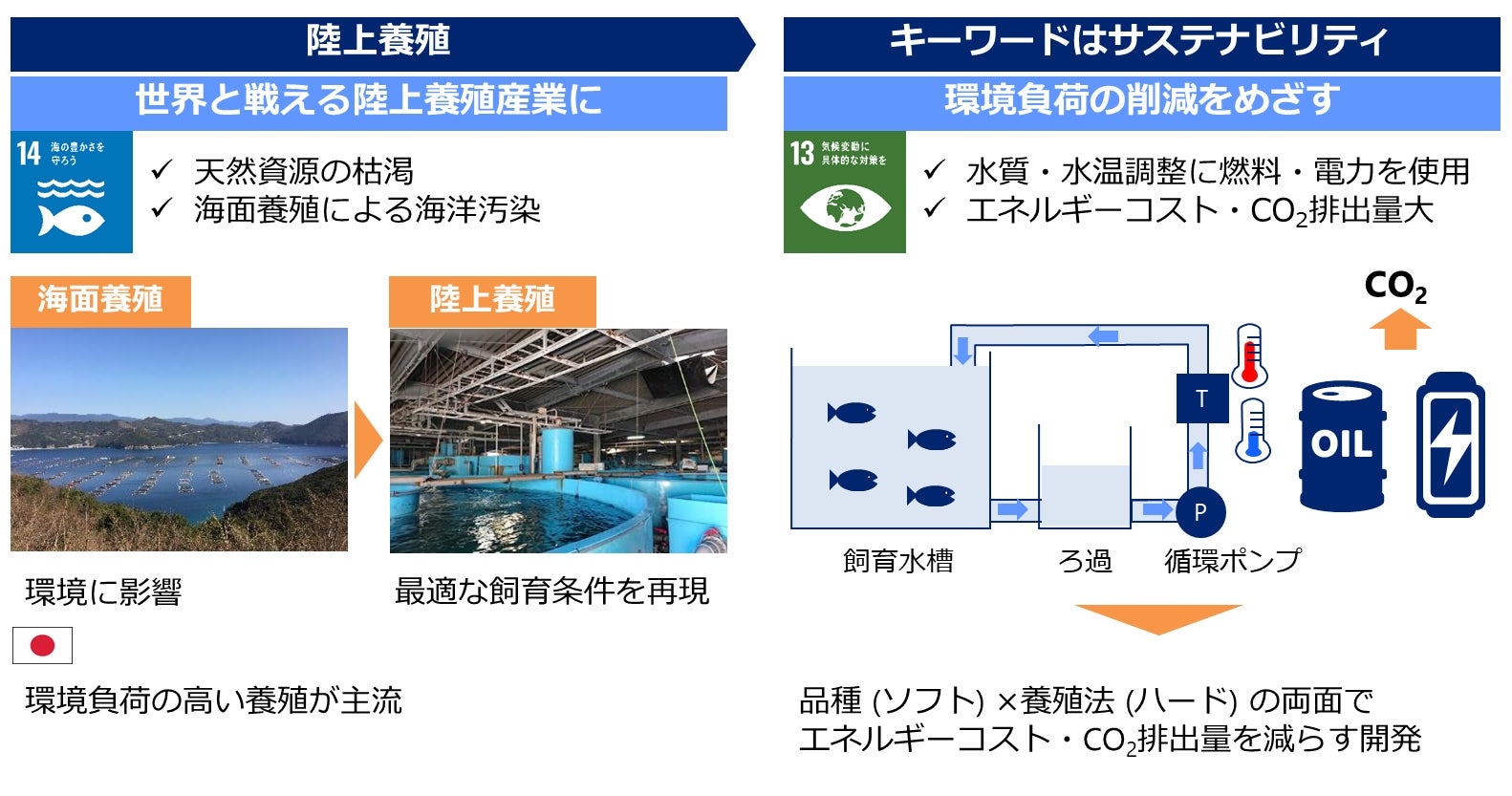 現在、水産業界においては、天然資源の枯渇や海面養殖による海洋汚染等が問題視されており、より環境負荷の小さい養殖手法として、陸上養殖が注目されています。しかし、現在の陸上養殖技術は、養殖魚にとって最適な水質・水温を維持するために莫大な燃料・電力を消費するため、エネルギーコストが大きく、大量の二酸化炭素の排出を伴うという課題を抱えています。
