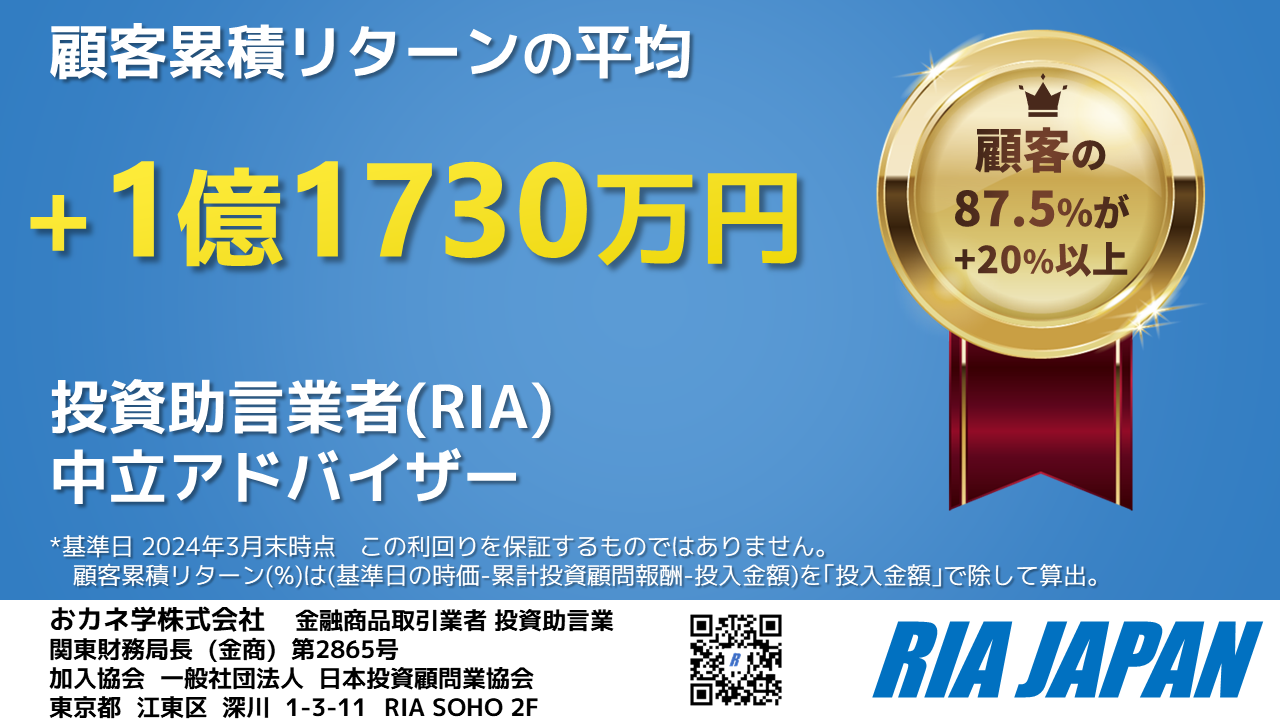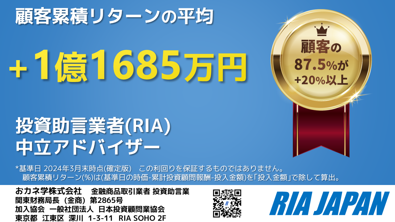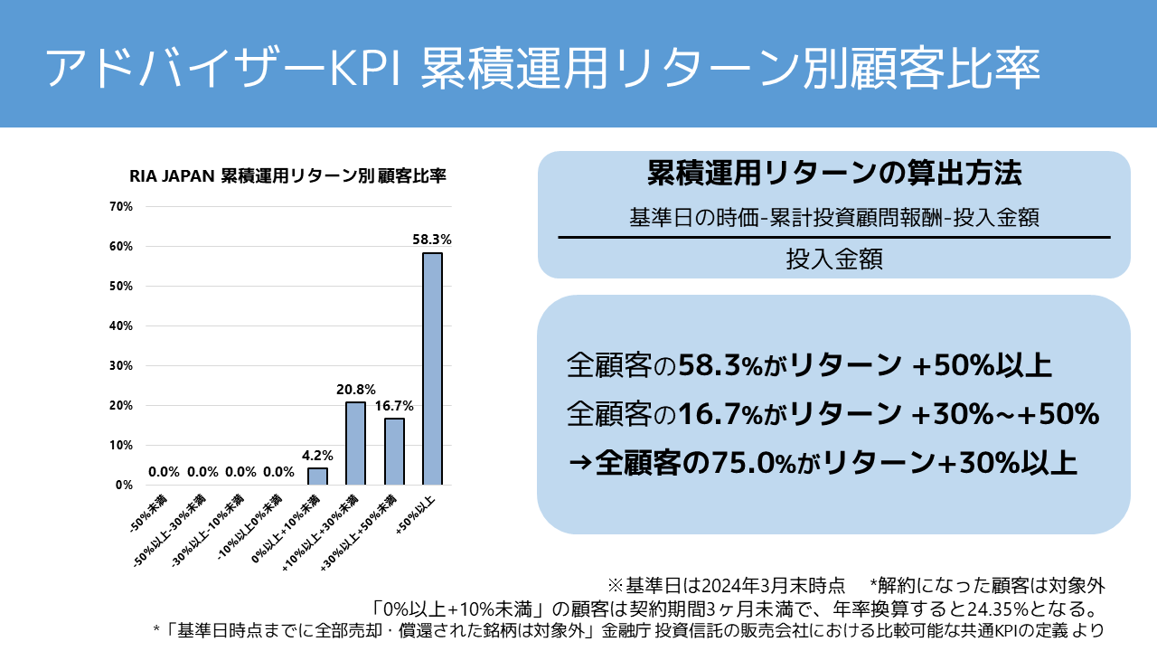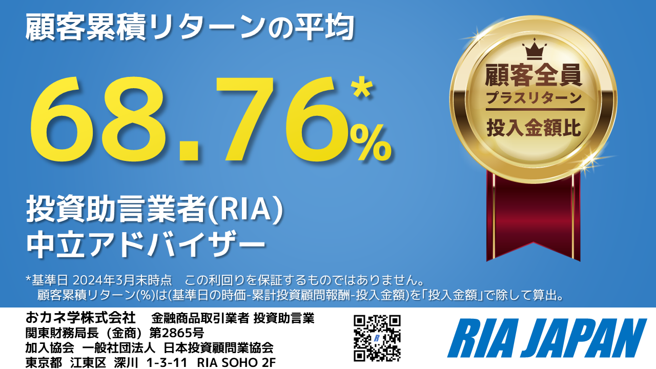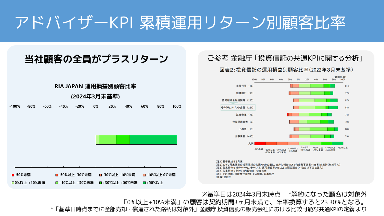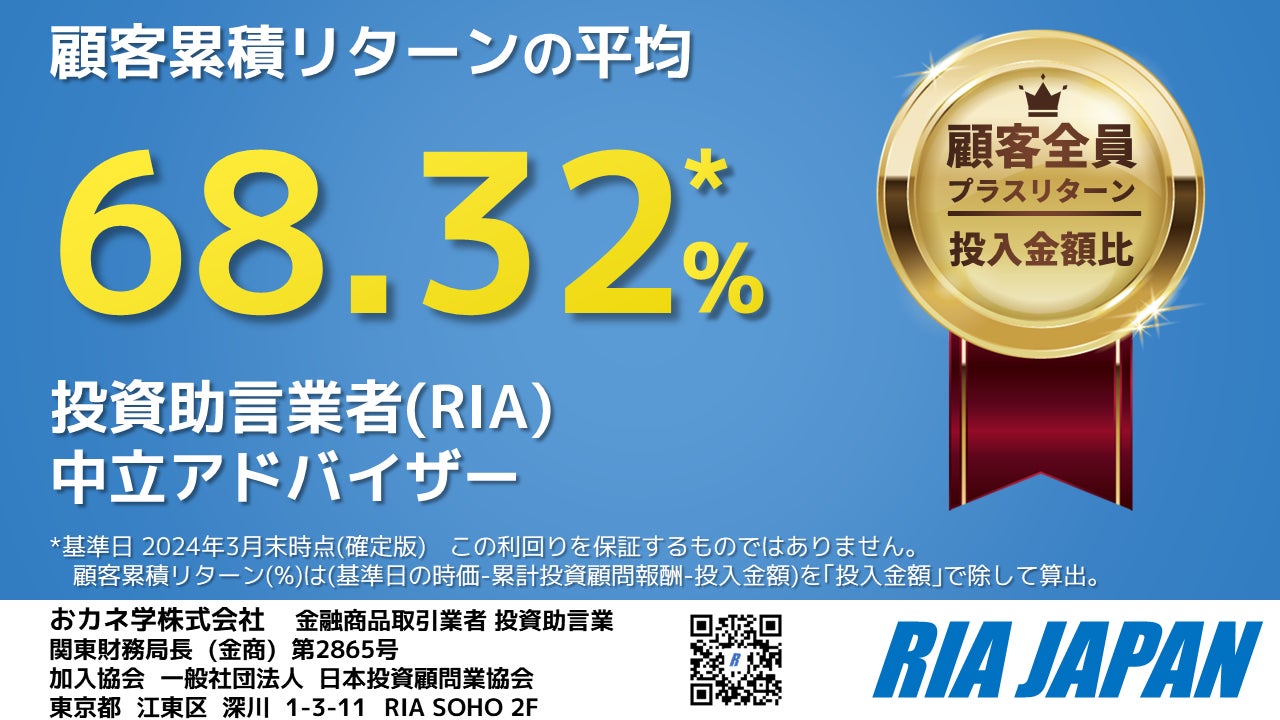 RIA JAPAN(投資助言業)、顧客累積リターン平均68.32%、元本割れゼロ 2024年3月末 独自「アドバイザーKPI」を公表
